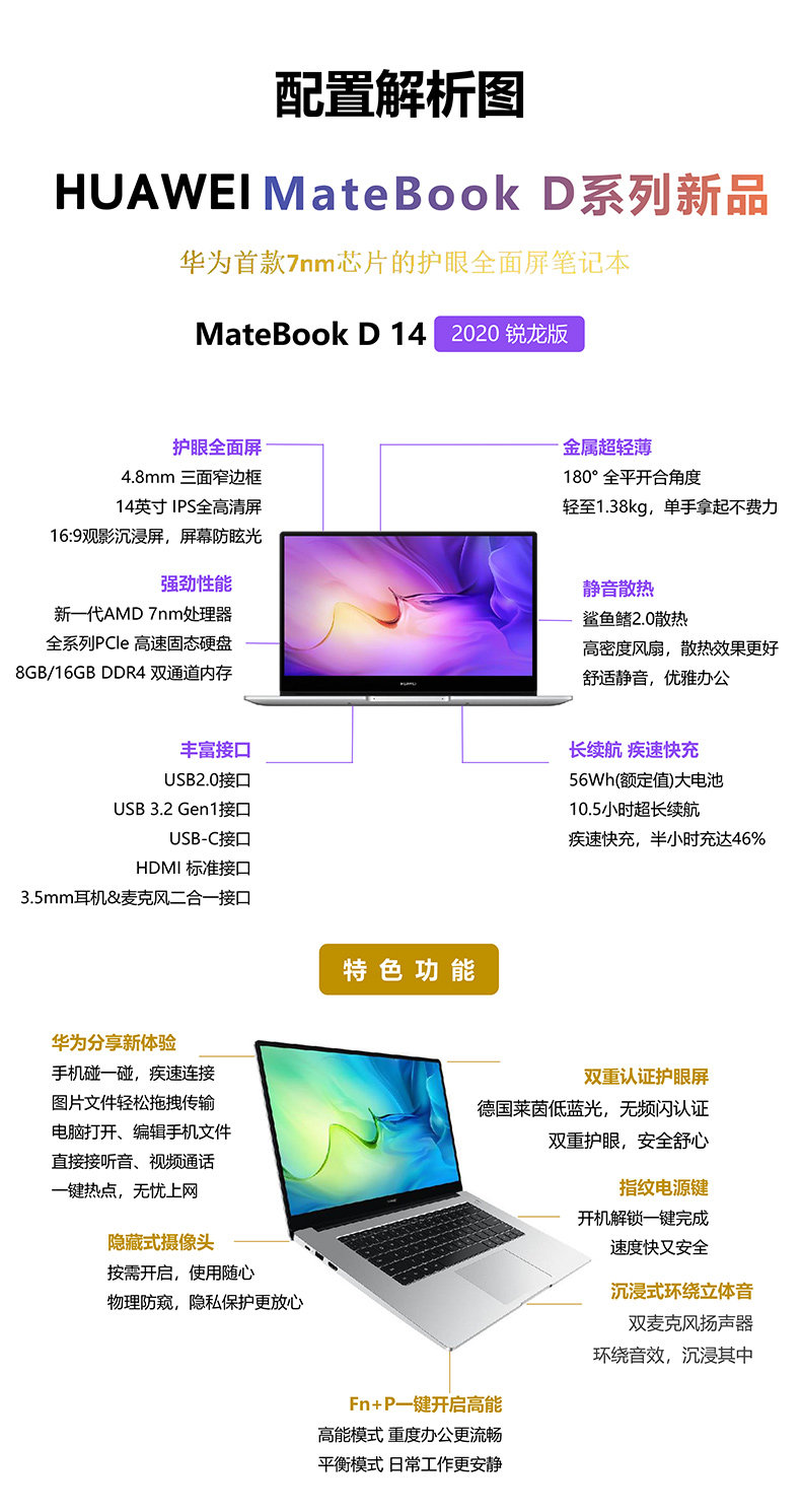 Huawei, ультратонкий легкий портативный ноутбук для школьников, D14/15, процессор AMD ryzen R7, 14 дюймов, бизнес-версия, полноэкранный дисплей, 2020
