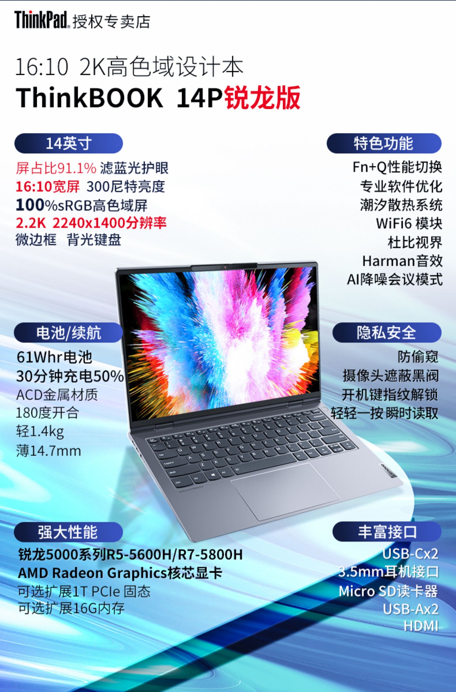 [Получите купон, чтобы сэкономить 300 юаней] Ноутбук Lenovo ThinkBook 14p Ryzen стандартного давления R5/R7-5800H 14-дюймовый высокопроизводительный тонкий и легкий офисный компьютер для бизнеса Экран 2.2K Pro
