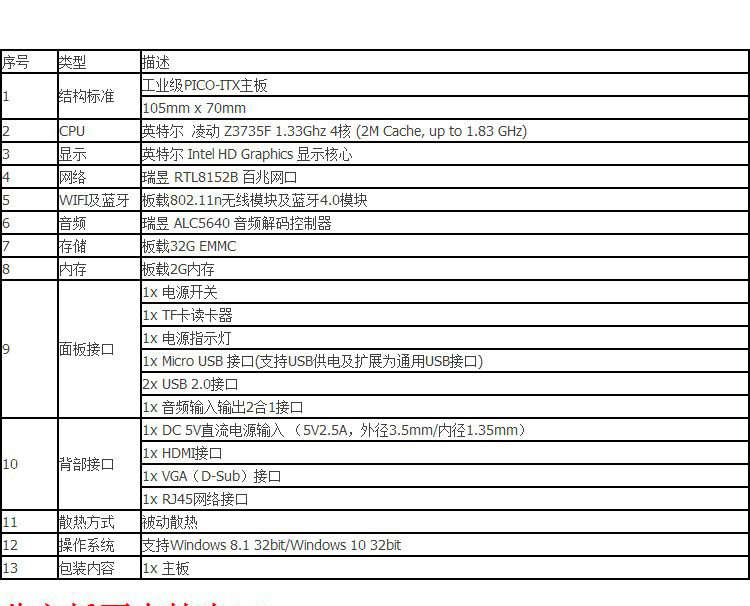 Не поддерживается XP и Win7, Нет рассеяния тепла вентилятора, около 3 Вт энергопотребления, 5 В. питания [Power 5V2A цена за единицу цена 20 юаней отдельно], VGA+HDMI Dual -Escreen Display, он применяется к встроенному, промышленному контролю, лечению, роботам и другим аспектам.