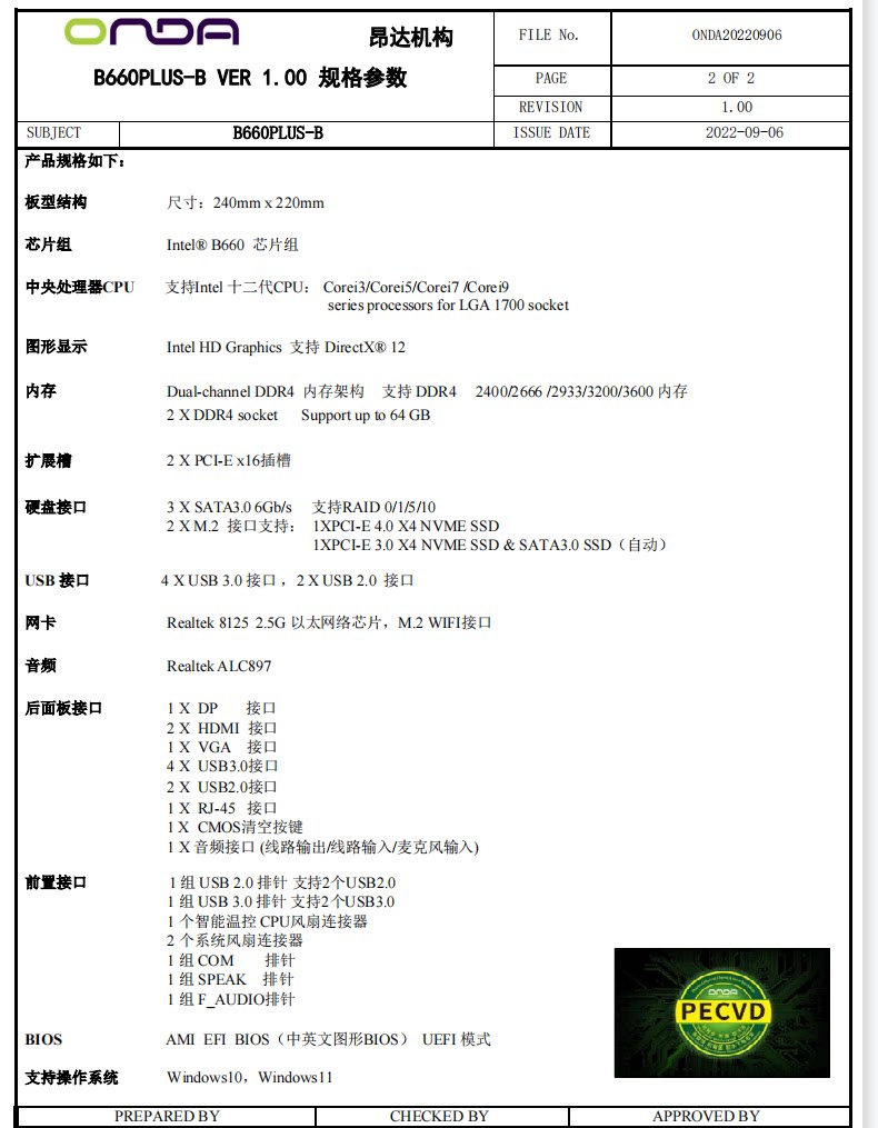Onda B660plus-W/B на стол компьютера Материнская плата LGA1700 Игла 12/13 Generation Dual-Channe DDR4/M2