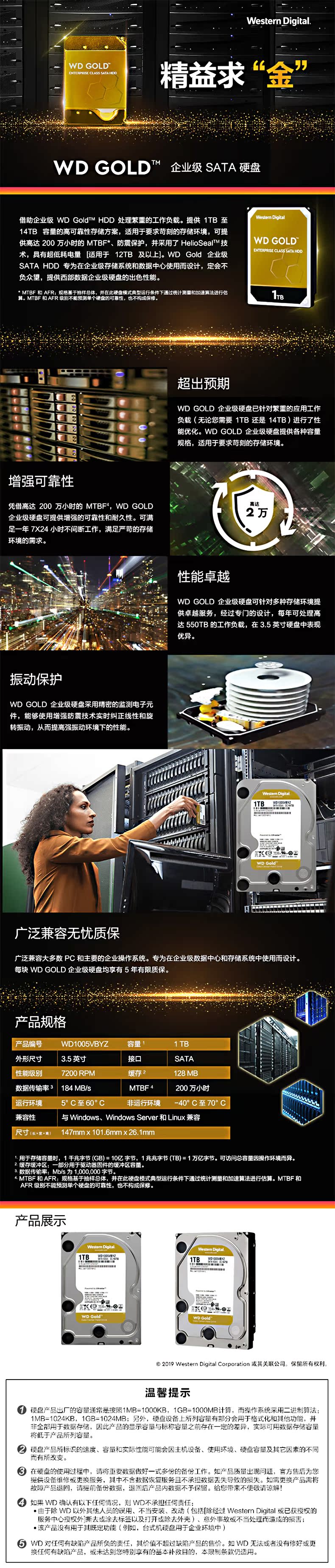 WD/西部数据 Золотой диск 1 ТБ SATA6GB/S 7200 RIVER 128M Enterprise Hard Disk WD1005VBYZ