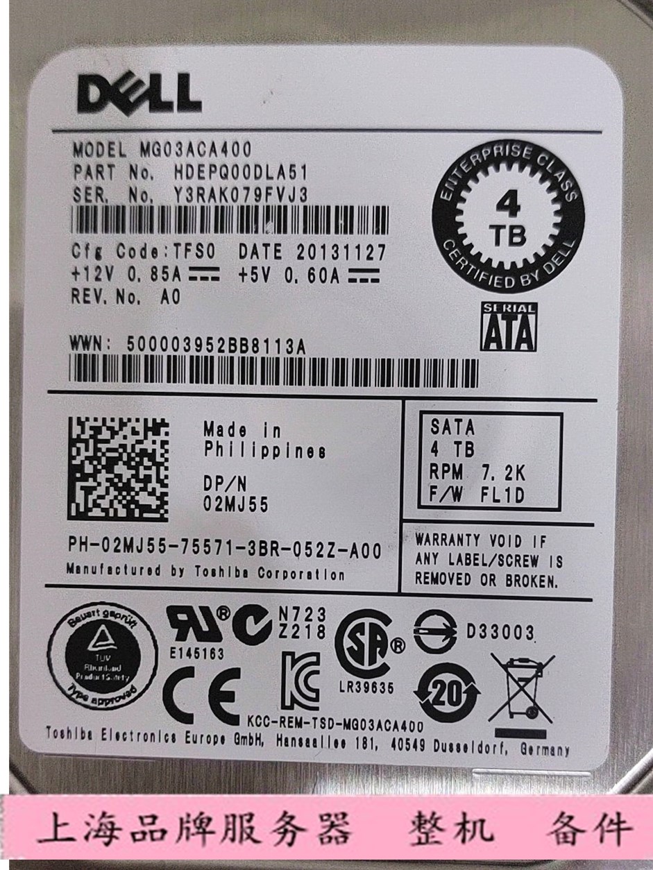 Dell Toshiba Mg03aca400 4T SATA 7.2K 3,5 02MJ55 2MJ55 Enterprise Hard Disk