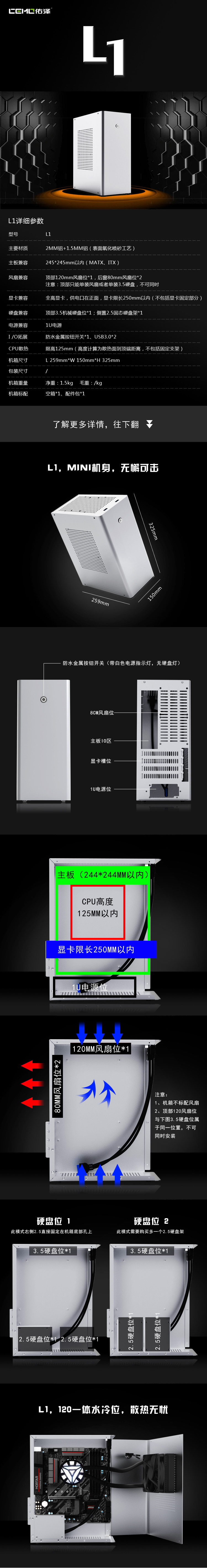 Yoshizawa L1 Все алюминиевые маткс настольный настольный компьютер Небольшой корпус небольшая стальная пушка большая графическая карта HID поддержка 120 Встроенная вода и холод