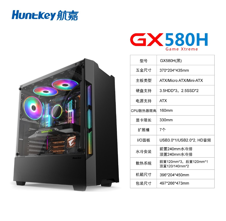Hangjia gx580h шасси настольный настольный тестируемый стекло прозрачный боковой прозрачные компьютеры ATX Шасси большая плата средняя башня шасси