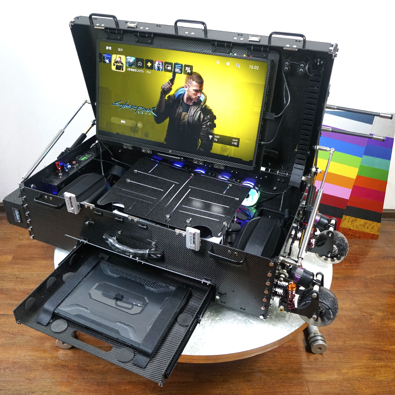 [本机箱为大型机箱,拥有通用版主机固定,与众不同之处是拥有独立的笔记本电脑存储仓,拥有键盘存储独立仓,且可以拉出单独使用。可以固定全部目前游戏主机,所有PS系列,从ps1 ps2 ps3 ps4 ps5 全系列都支持固定,xbox系列全系列主机全部支持固定,ns主机或任何与ps5大小相近的主机均可固定。本机箱有两个独立音响的固定位置,可以固定家用桌面大型监听音响,音响属于买家自行选定购买,非附带物。本机箱拥有UPS功能,即电池接着可以边插家用电边给电池充电,拔掉家用电,主机等供电不中断无缝继续,电池自动开始供电的功能,电池位置有两个,单个电池供电大约在2~3小时,机箱集成了非常多的供电设施,集成了显示器供电,主机供电,还有usb快充,散热,测温等等,做到一箱的供电集成,无需插拔线,简单安一个开关即可开始使用。本机箱拥有开合机械阻尼和支撑液压的装置,使得开箱非常顺畅。此外机箱也拥有最新一代的独立悬挂减震轮系统,可有效的进行日常路面不平的减震,大幅度减少对整体的冲击,从而再机箱内部均固定好的情况下,减震效果达到最佳。本机箱也支持蓝光碟片的插入和拿出,在固定好主机后,无需担心。]