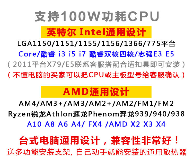 &Усовершенствованная версия NBSP; Bingman из четырех медных труб обеспечивает большое количество вспомогательных материалов, включая крем для рассеивания тепла, установку для крепления и другие аксессуары.Многофункциональная база радиатора, предоставленная радиатором, может поддерживать все платформы процессоров Intel, что означает, что продукт может использоваться в продуктах серии SNB и продуктах LGA775 и продуктах AMD. Это настоящий продукт поперечного платформы.
