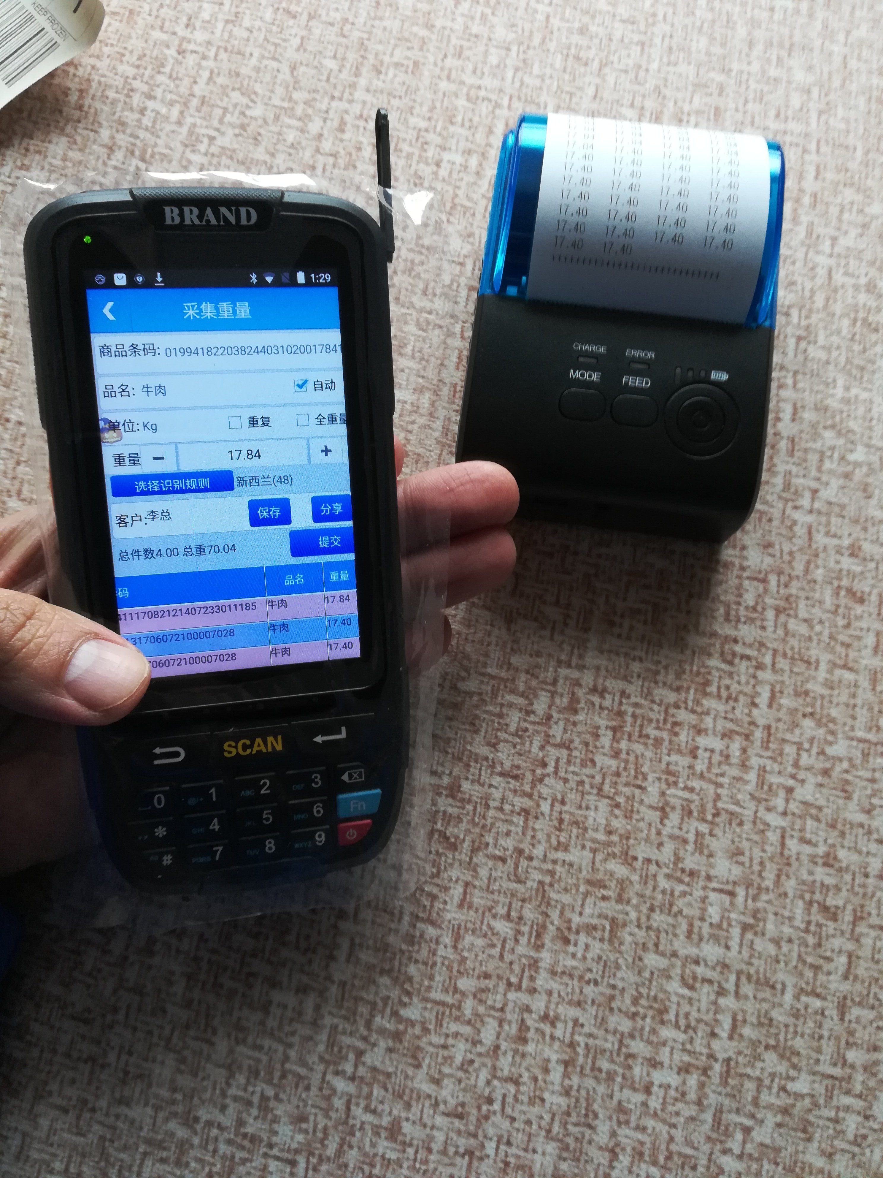 1: штрих -код содержит упаковку с информацией о весах, сканируйте штрих -код напрямую, извлекает информацию о весах в штрих -коде, автоматически сканирует код для накопления. После завершения подключите принтер билета Bluetooth и распечатайте небольшой билет.