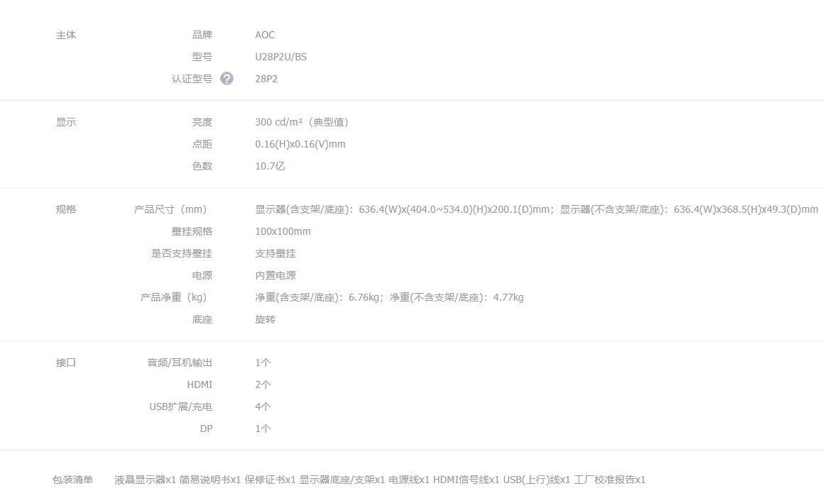 Официальная первая конфигурация: 28-дюймовый AOC, 4K, 10 бит, IPS, широкая цветовая гамма, режим HDR, заводская цветокоррекция, низкий уровень синего света и отсутствие мерцания, быстросъемный офисный компьютерный монитор с вращающимся подъемником U28P2U/BS