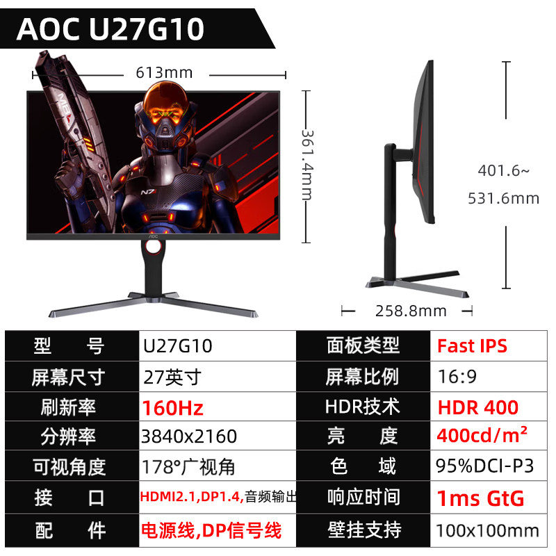 AOC Игровой ЖК-дисплей, крутящийся экран, 27 дюймов, 27G, G10, 160гц