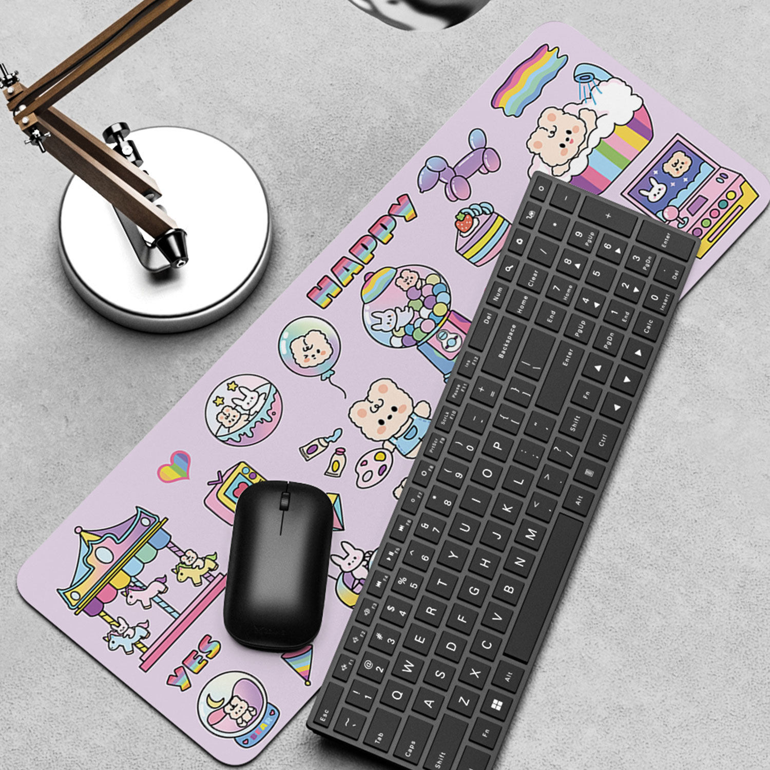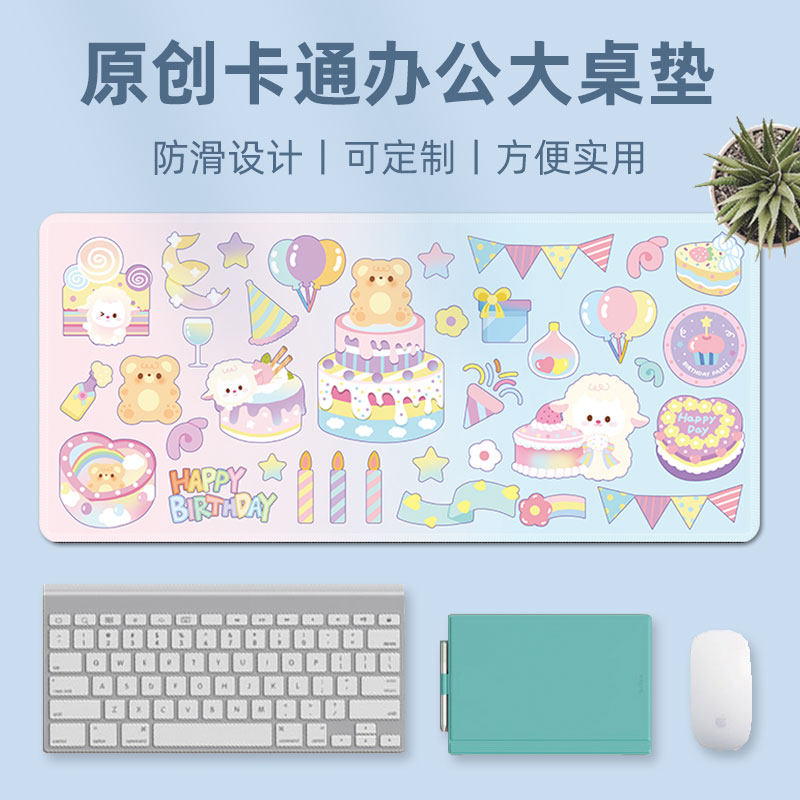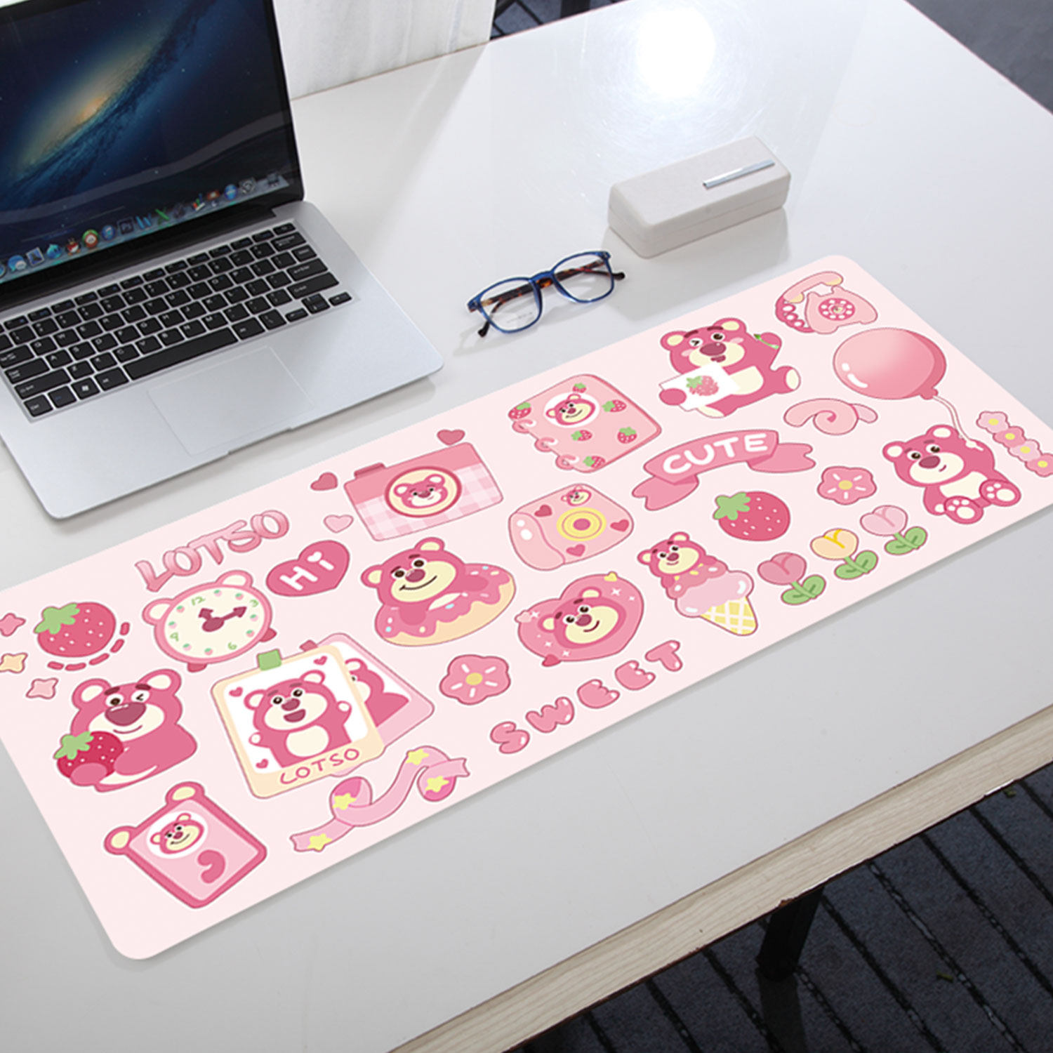 Мышка, большая розовая милая клубника, мультяшный ноутбук, клавиатура, настольный коврик