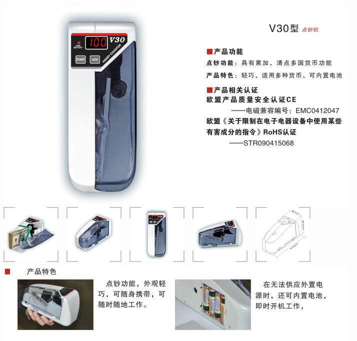 V30 разработан в соответствии с характеристиками бумажных валют, таких как Renminbi и USD.Есть быстрые и точные характеристики.Это штрафная машина, которой сегодня можно управлять батареями на международном рынке, если он установленЧетыре 5 батареиВы можете нести с собой «изысканный случай».