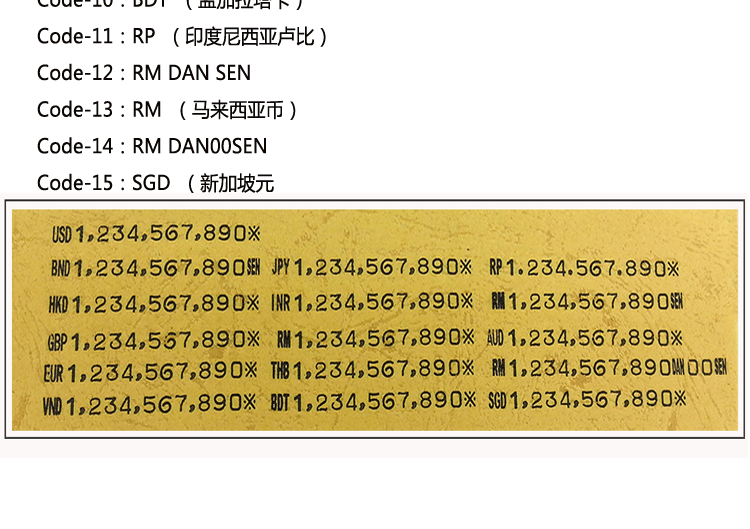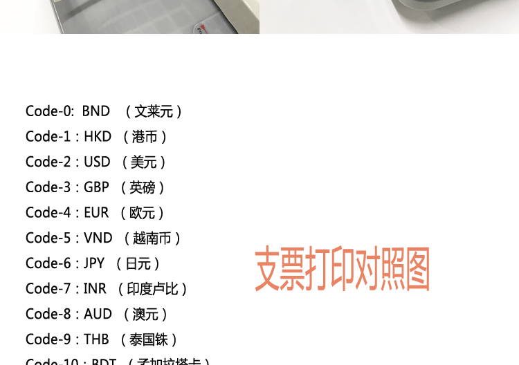 Удержать“ Ключ кодирования кода““C” ЦзянбайЗатем нажмите соответствующий код номера валюты выше, например, вам необходимо распечатать код доллара в Гонконге“HKD"затем нажмите“1&Rdquo; в настоящее время дисплей отобразит Code-1, уложите стержень бумаги и отрегулируйте штурмовый стержень, а затемНажмите на сумму по требованию"P"Ключ можно напечатать.
