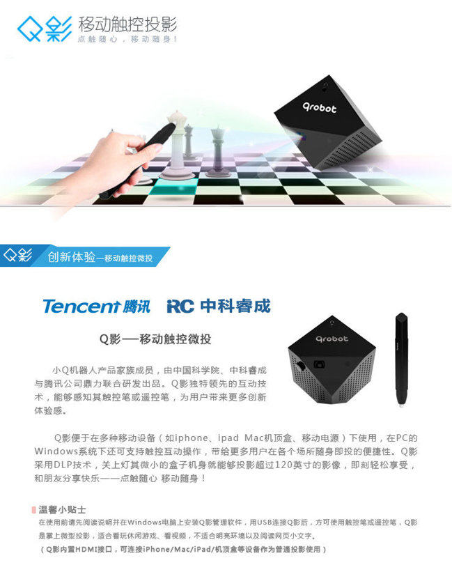QROBOT Q Shadow -это первая внутренняя мобильная микроэнергетическая проекция. Это основной проект стратегического сотрудничества китайской академии наук и Tencent. Совместно, выпущенный Tencent, Китайская академия наук и Шэньчжэнь Чжонк Руихенг Intellent Technology Co., Ltd. Полем