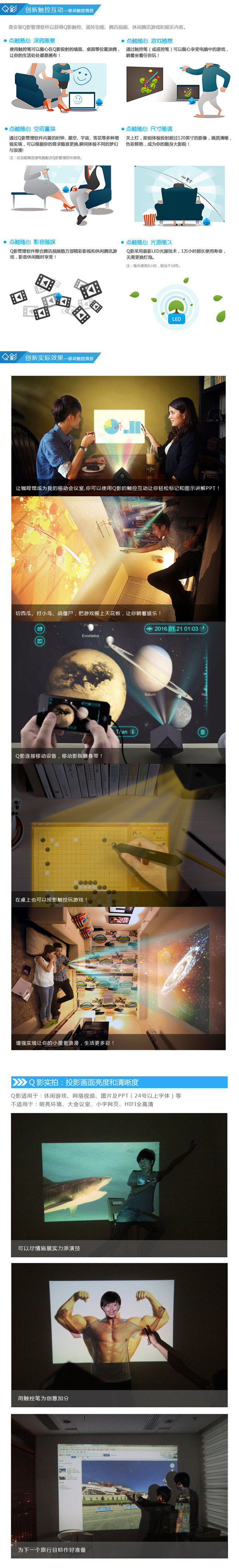 Q Shadow имеет ведущую интерактивную технологию. Он может воспринимать сенсорную ручку и ручку с дистанционным управлением Q Shadow, чтобы управлять проекционным экраном, похожим на мыши. интереснее.Q Shadow использует технологию DLP. Хотя она меньше, чем кулак, она может спроецировать более 120 дюймов изображений. Качество изображения ясное и красочное.