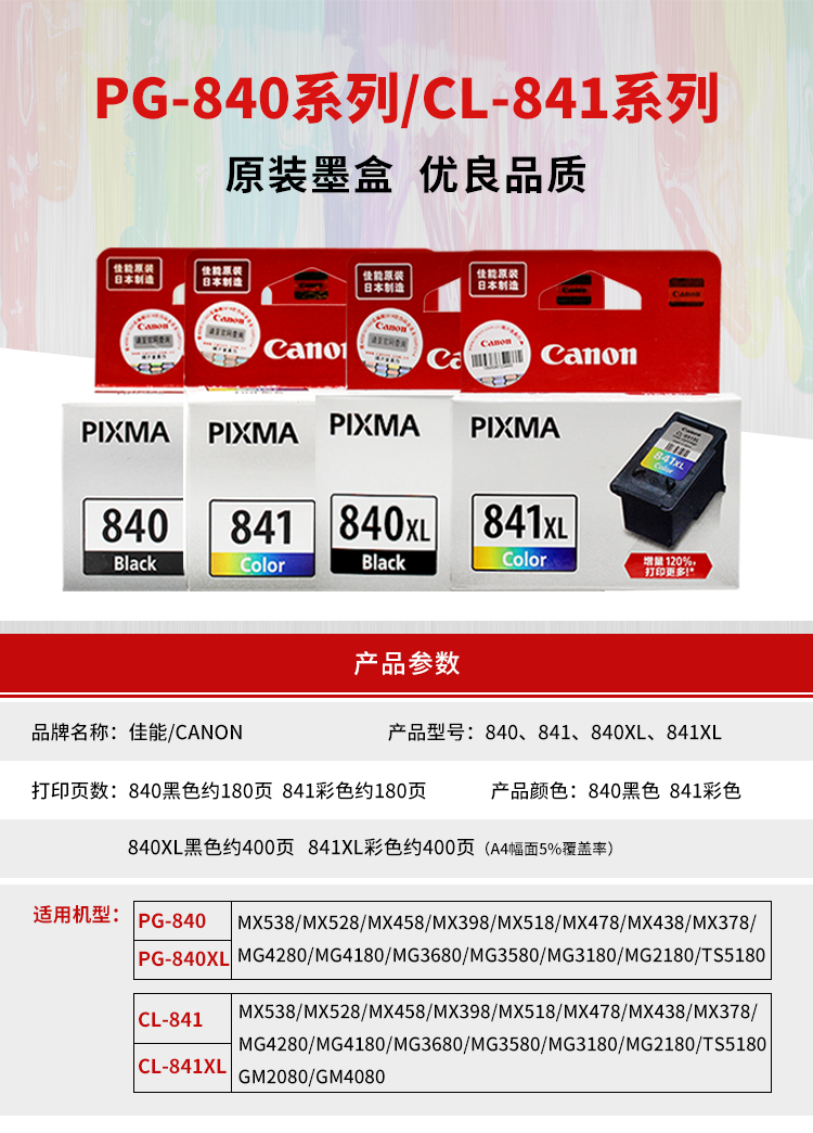 | Цвет: | PG-840 черная стандартная емкость, CL-841 Цветная стандартная емкость, PG-840XL Black Light емкость, CL-841XL цвет большой емкость, Canon 840+841 Стандартный полный комплект, Canon 840xl+841xl Большой емкость полного комплекта, Canon 508 фото бумага 100 листов/сумки 3 пакета |