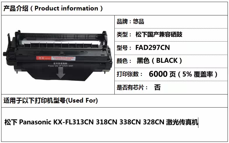 悠品 CX-FAD297CN CARTRIDGE, подходящий для Panasonic KX-FL313CN 318CN 323CN 333CN 338CN Печать и Факс Машина.