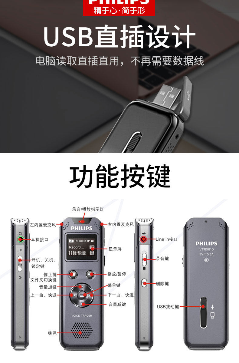 Philips VTR5810 Запись Pen Micro Professional High -Definition Control Control Recording FMMP3 Player Card