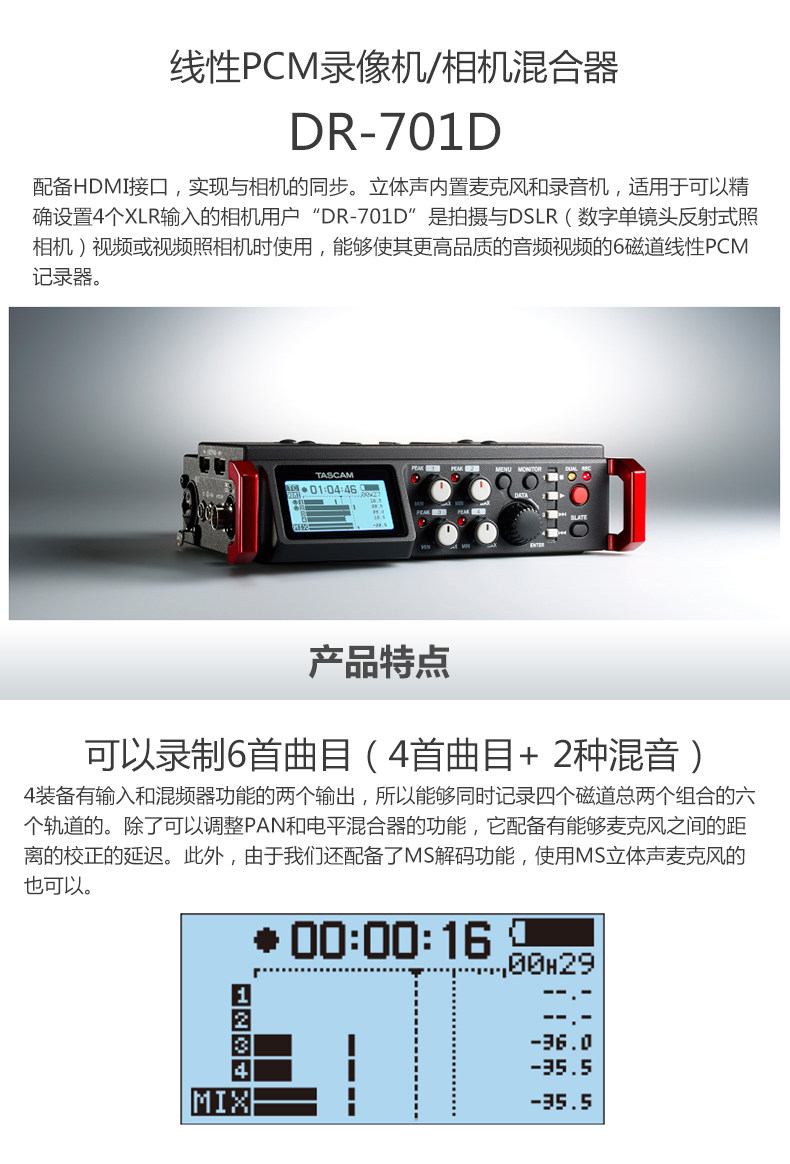 TASCAM DR-701D Рекордер SLR Камера камера камера камера 6-трек записывает интерфейс HDMI китайский меню