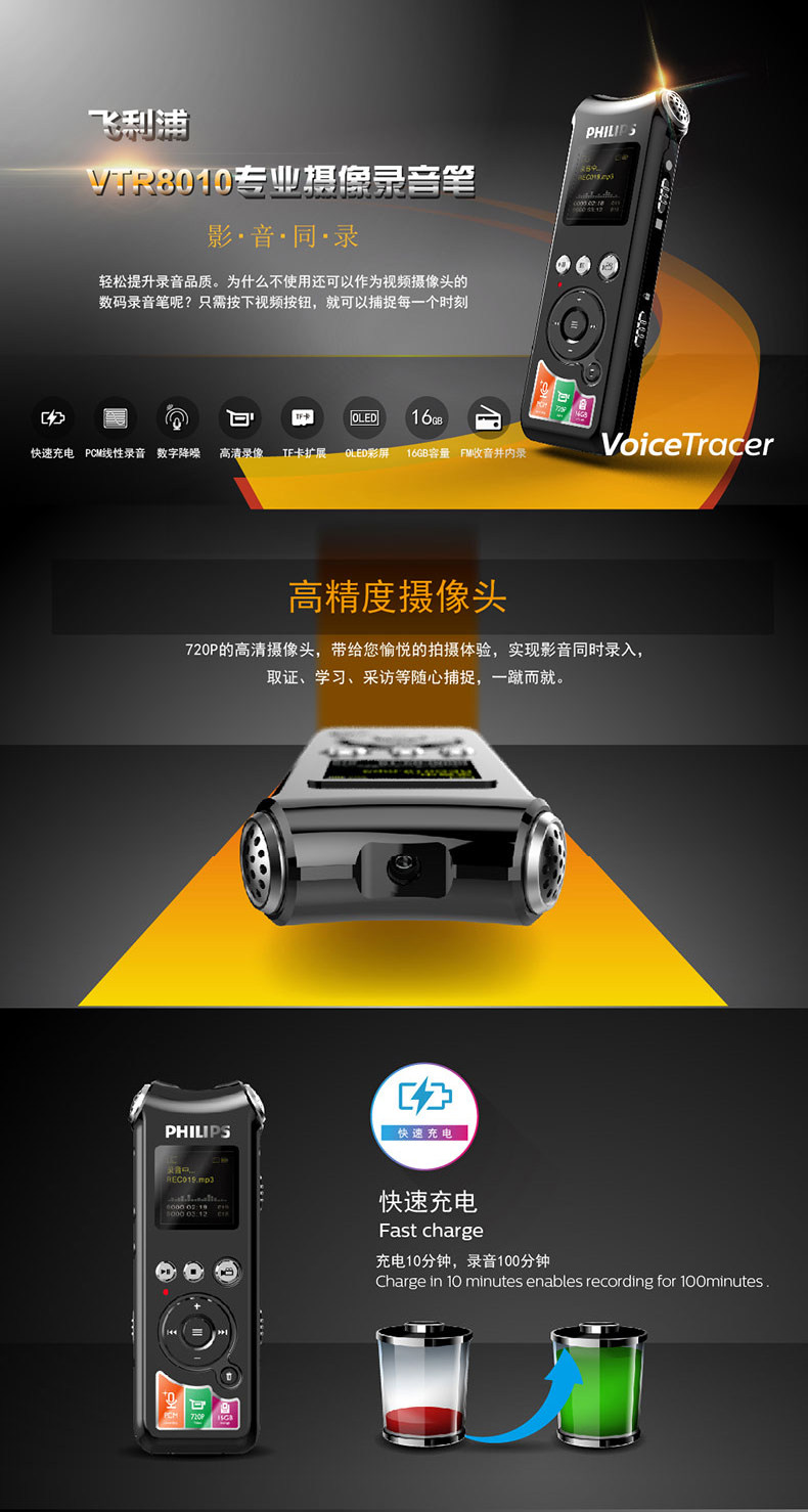 Philips VTR8010 Запись ручка видео профессионал HD снижение шума удаленное 720p HD Видео видео mp3