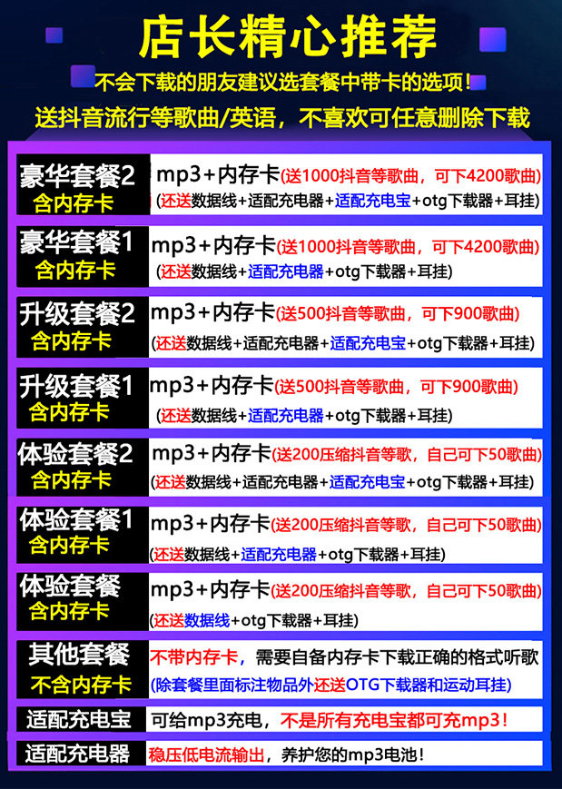 | Тип пакета: | Зарядный кабель, карта памяти, MP3, Пакет опыта (с картой памяти) дайте 200 сжатых песен, Advanced Package 1 (с картой памяти) может скачать 2000 песен, Luxury Package 1 (с картой памяти) может скачать 4000 песен, Пакет опыта 1 (с картой памяти) дайте 200 сжатых песен, Advanced Package 2 (с картой памяти) может скачать 2000 песен, Пакет опыта 2 (с картой памяти) дайте 200 сжатых песен, Luxury Package 2 (с картой памяти) может скачать 4000 песен, Зарядное устройство, зарядный кабель, MP3, Mp3+строка зарядного устройства OTG+зарядка сокровищ (без карты |
