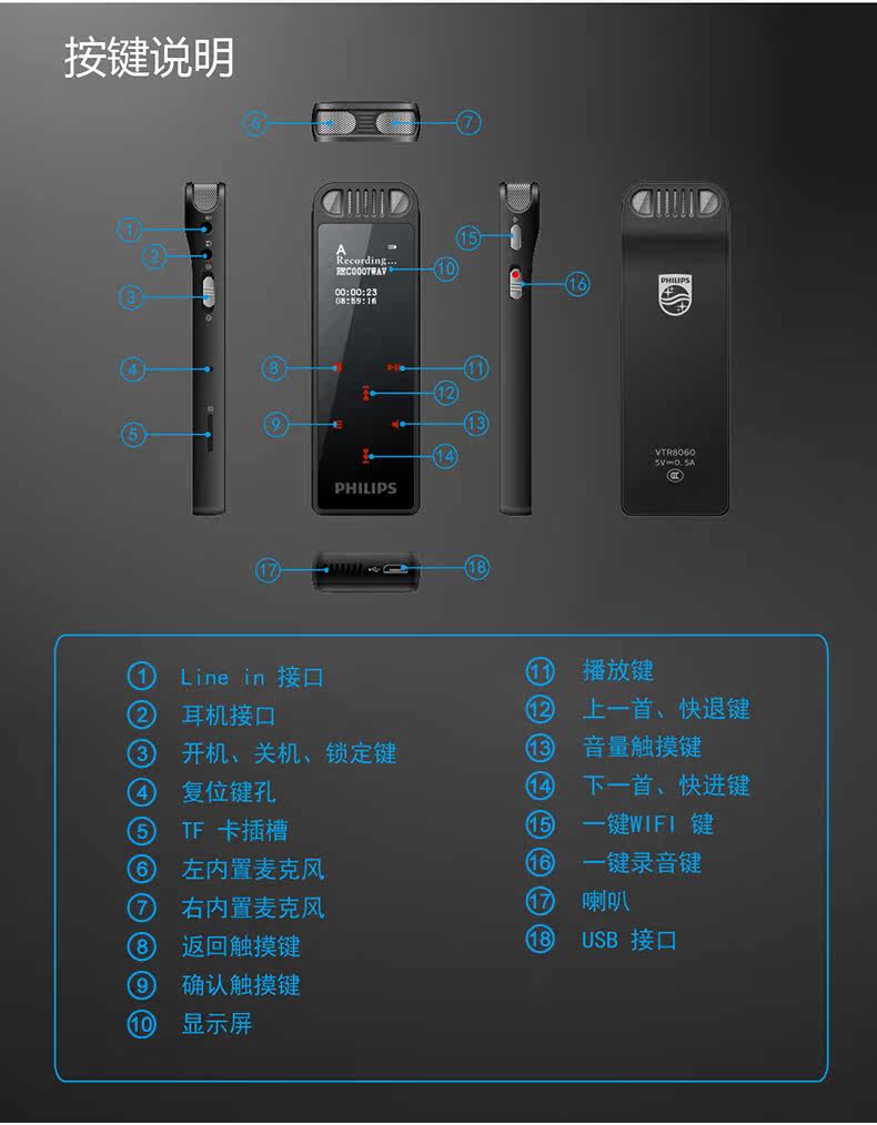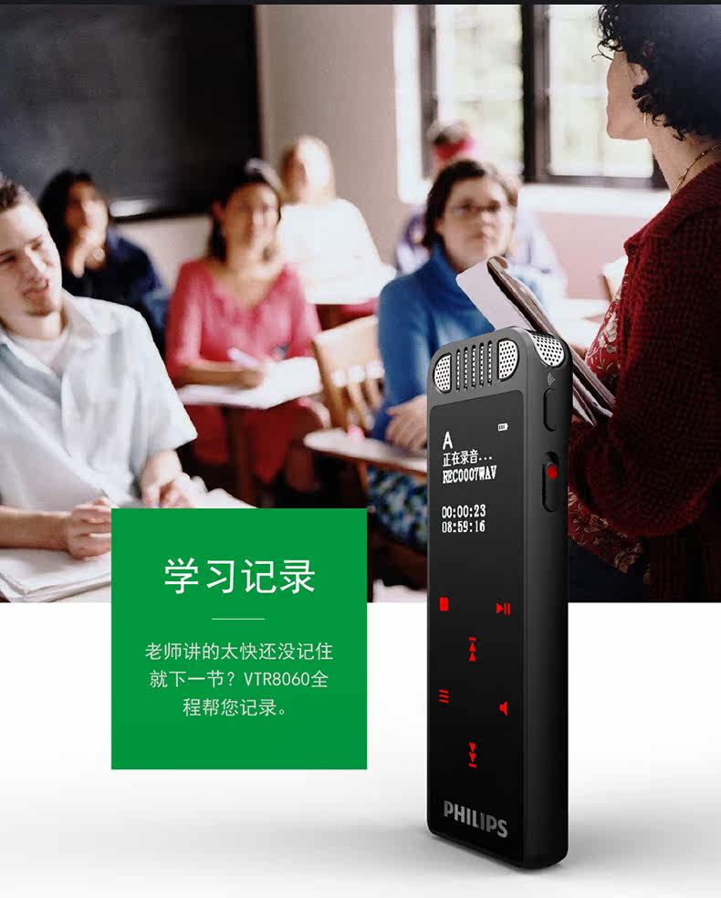 Philips записывает Pen Vtr8060 Профессиональный HD -снижение шума бизнеса WiFi Удаленные голосовые передачи в класс для класса