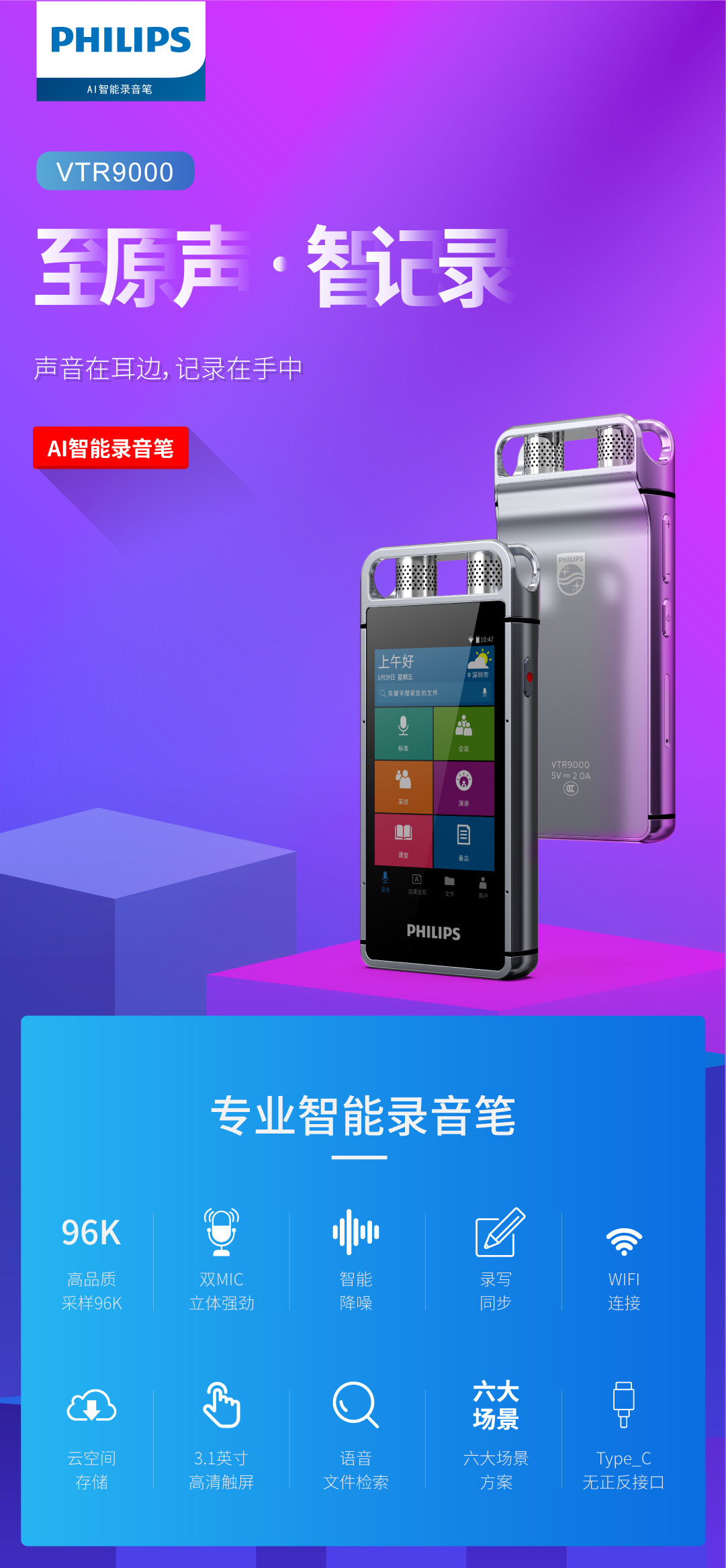 Philips запись Pen Vtr9000 Professional High -Definition Super Survide Sment Smart Student Записывает перевод перевода