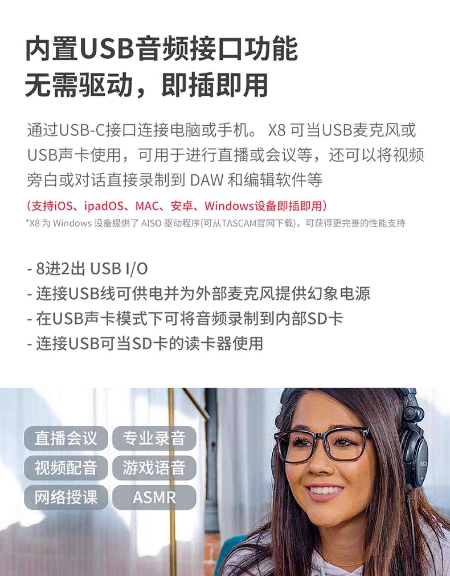 TASCAM X8 ASMR Sleep Live Recording Press 192K 32 -битный HD Несотражающий компьютер мобильный телефон в прямом эфире