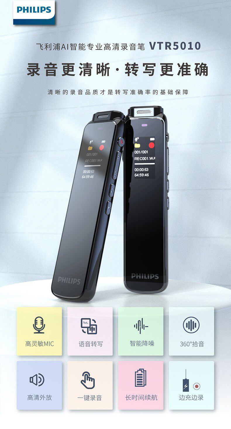 Philips записывает Pen Vtr5010 Профессиональный HD -снижение шума студенты в классе для записи текста передачи