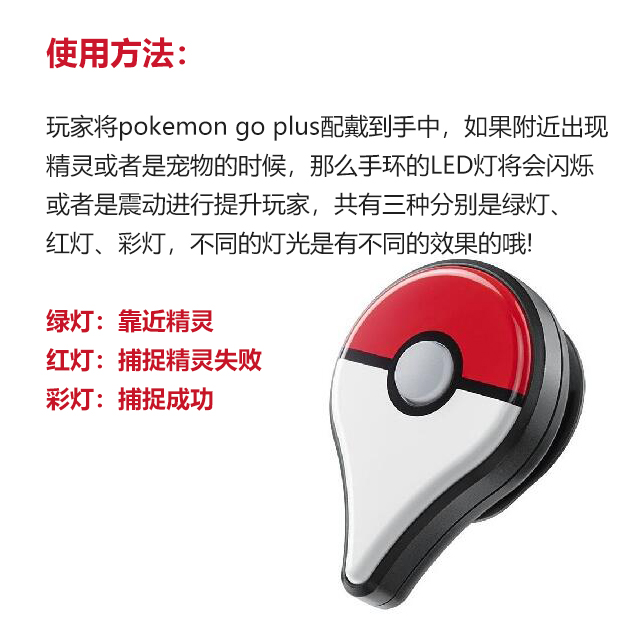 Игроки носят Pokemon Go Plus в своих руках. Если поблизости появляются эльфы или домашние животные, светодиодные огни браслета будут мигать или вибрировать, чтобы улучшить игрока. Цветные фонари, разные огни имеют разные эффекты!