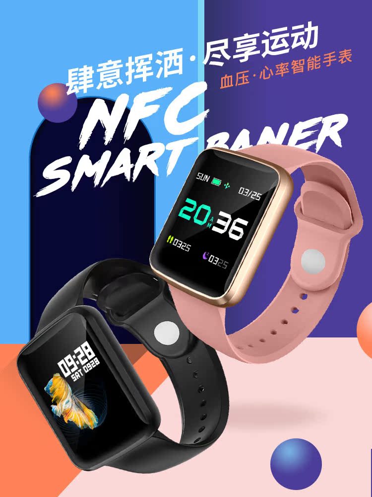 Color Ping Smart Movement NFC Браслет Монитор Монитор сердца сердца кровяное давление, Apple Vivo Vivo Honor Oppo Xiaomi Мужчины и женщины Пара смотрят многофункциональный водонепроницаемый бегун
