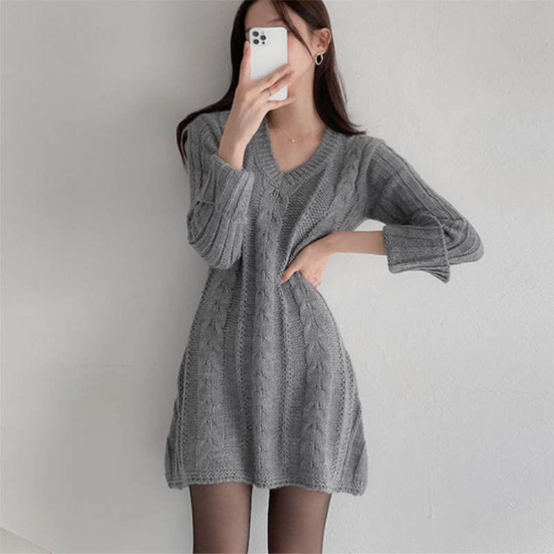 Платье, зимний трикотажный сексуальный лонгслив, ретро юбка, подходит для подростков, коллекция 2021, V-образный вырез