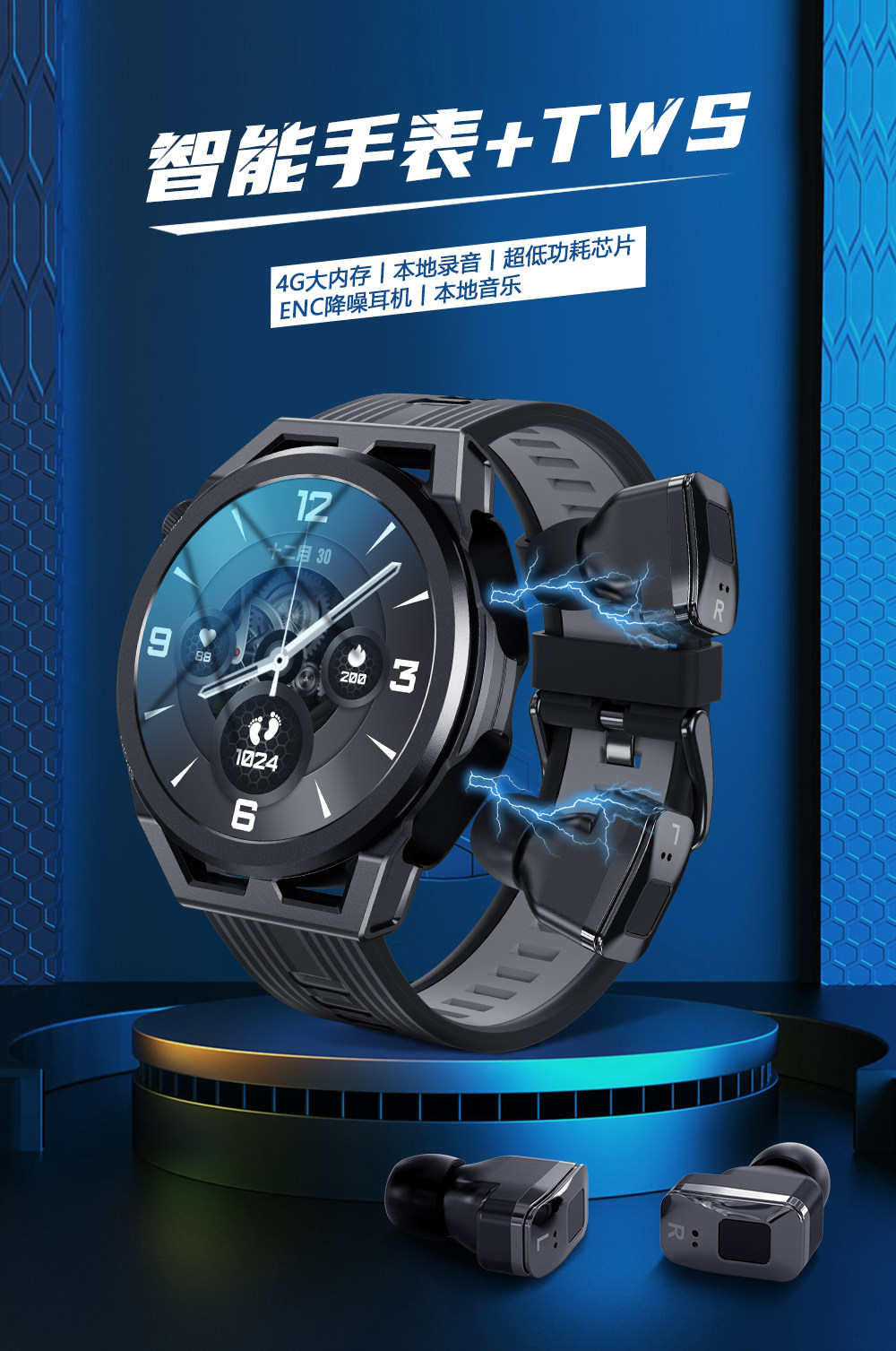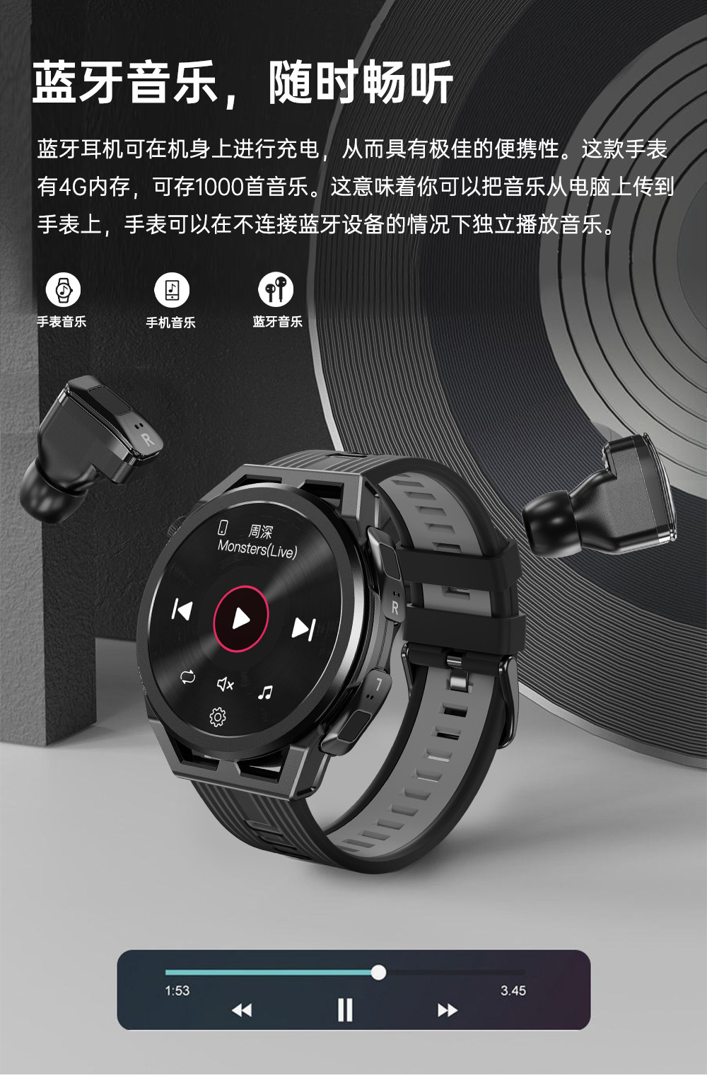 Браслет, наушники, универсальные умные часы, 4 гигабайта объём оперативной памяти, bluetooth, «три в одном», отслеживает сердцебиение, измеряет давление