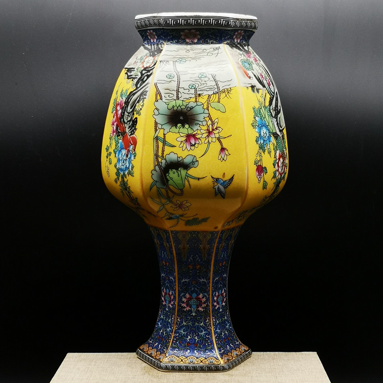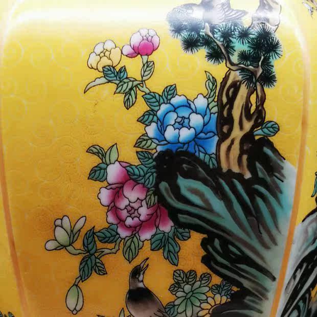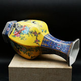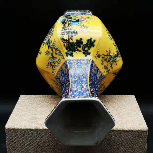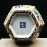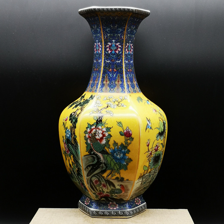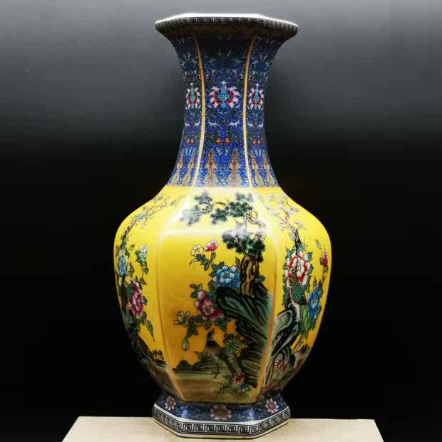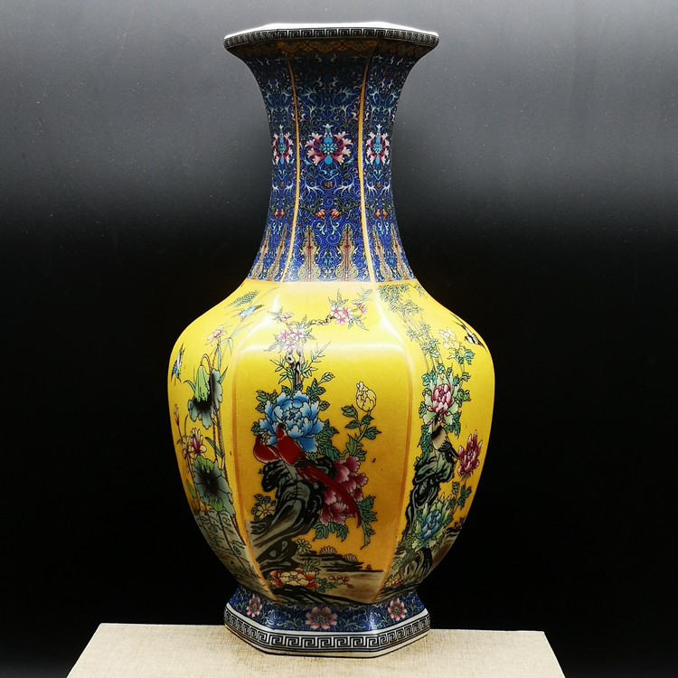 Qianlong год желтая грунтовая эмаль цветок и птица шестисторонняя большая ваза для гостиной китайское классическое украшение имитация императорских фарфоровых украшений