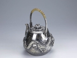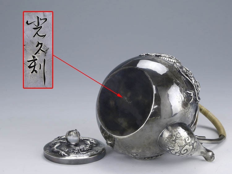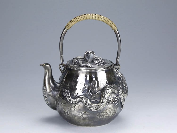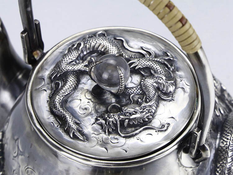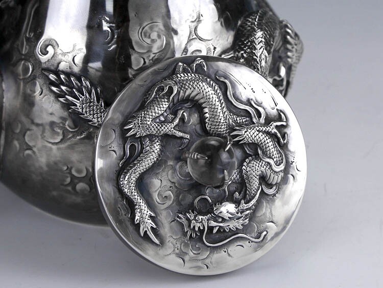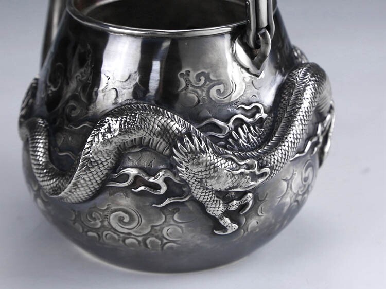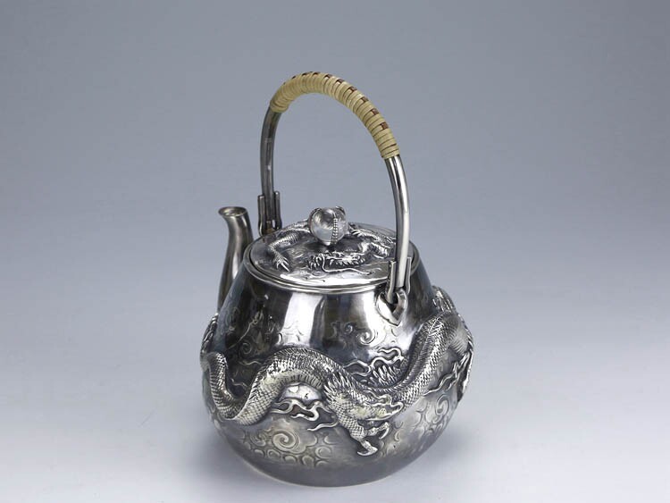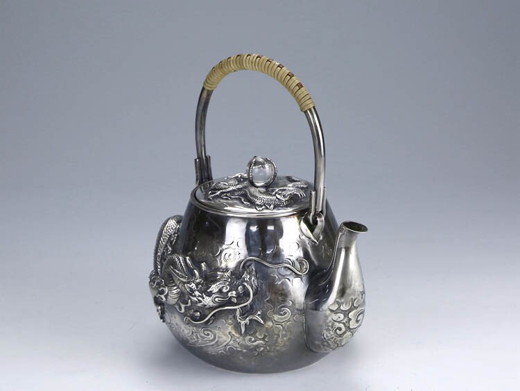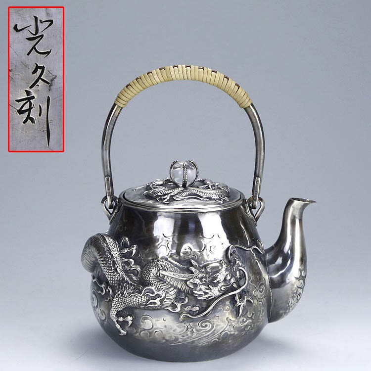 Серебряное серебристое серебро в Японском периоде Мейдзи периода Мэйдзи, стерлинговой серебряной ручной работы с высоким рисунком дракона жемчужного супа с серебряным горшкам чайник
