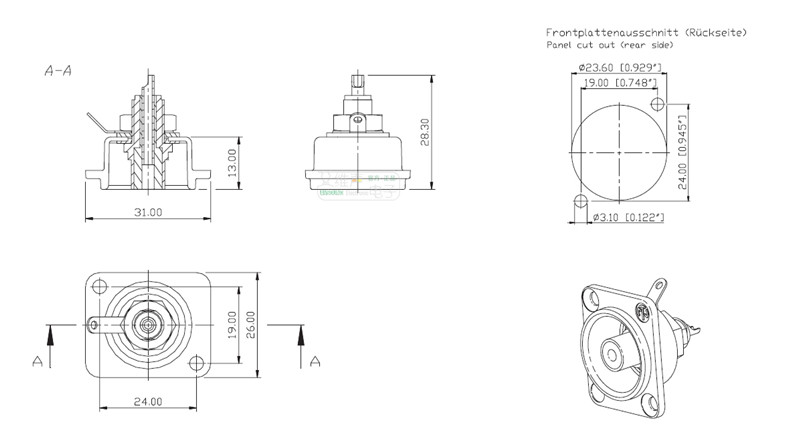 Фоно -гнездо помещается в никелевую оболочку, красную изоляционную площадку, сварной.