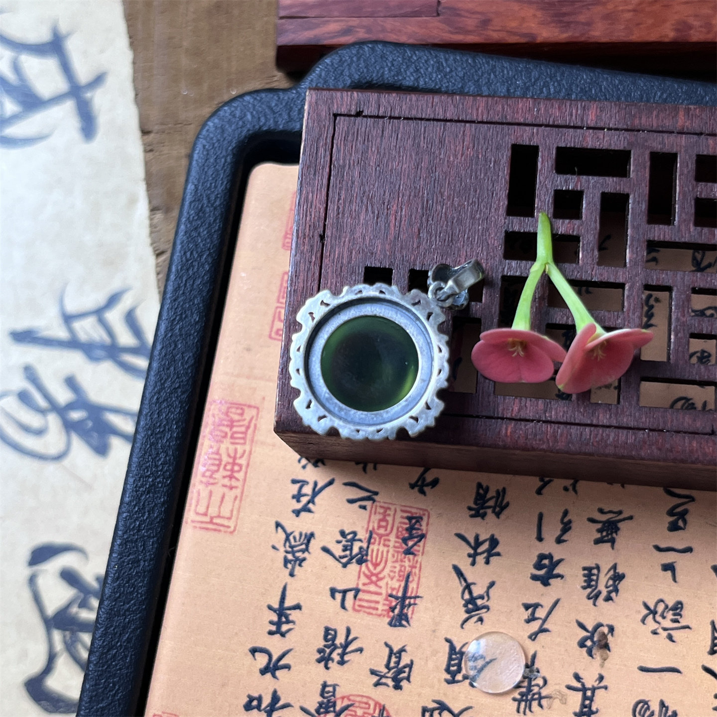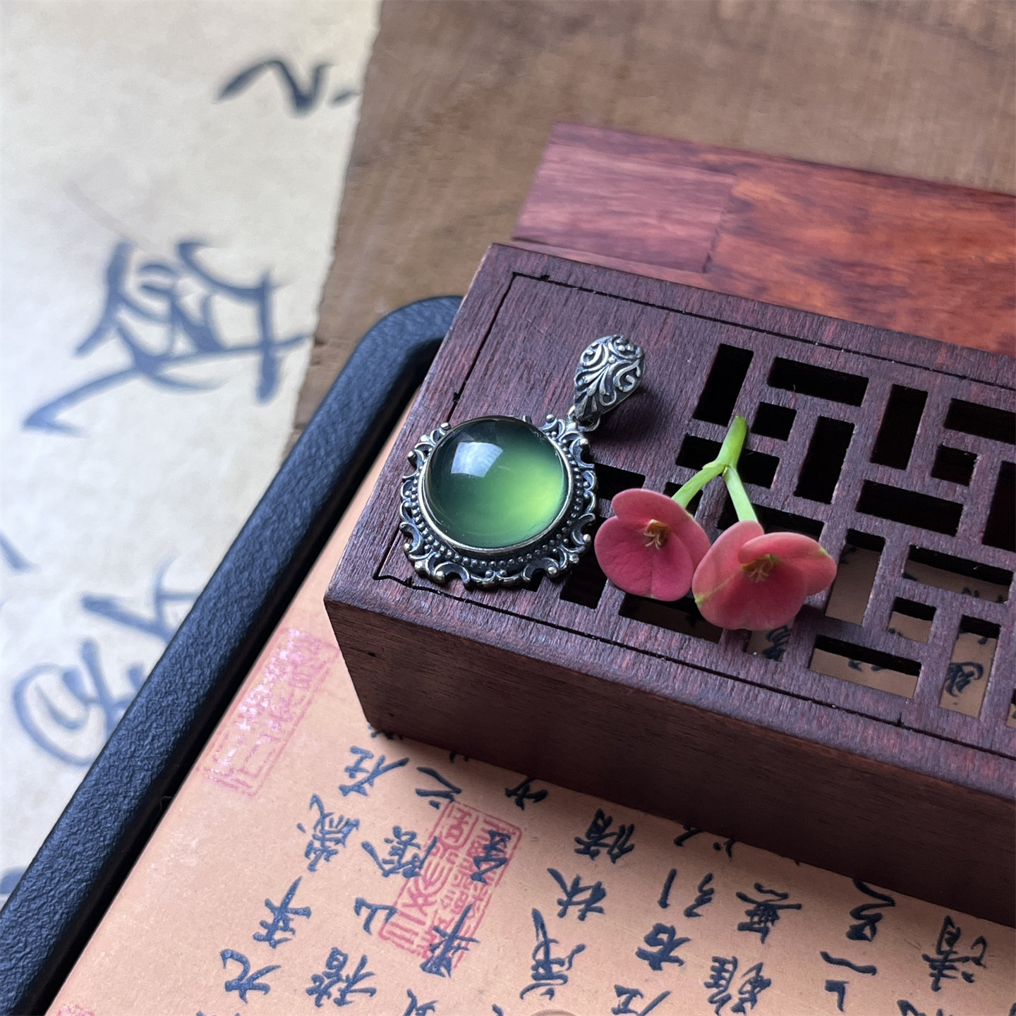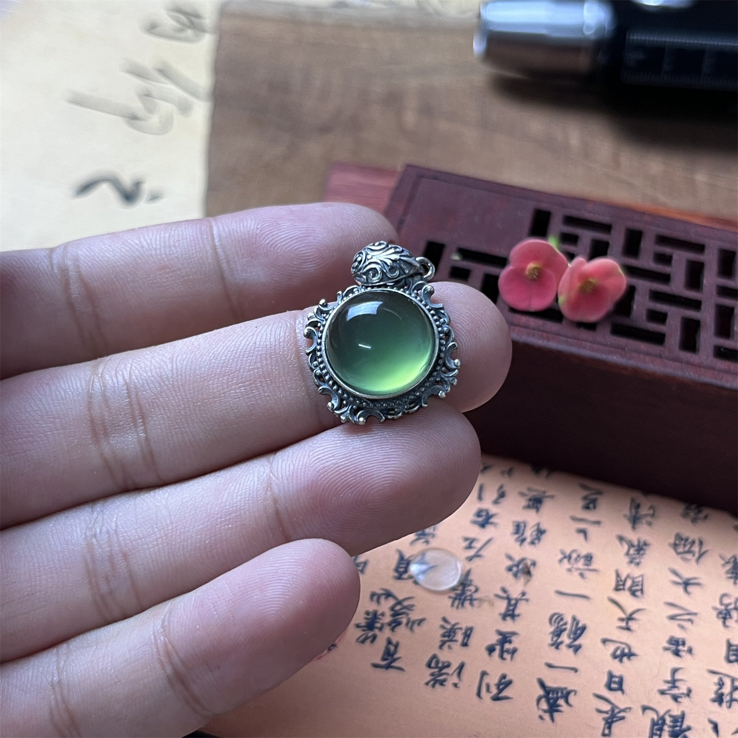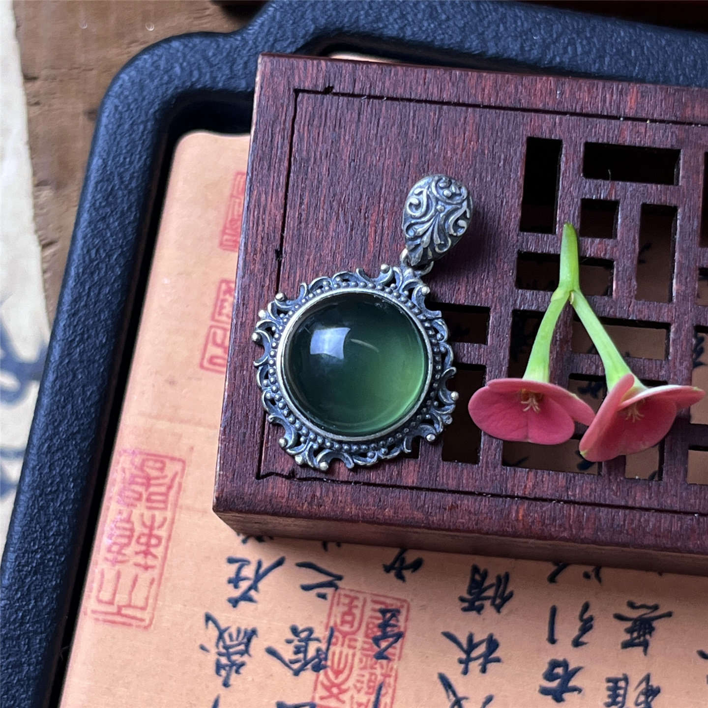 Натуральная цепочка до ключиц из нефрита, подвеска, качественная инкрустация камня, серебро 925 пробы