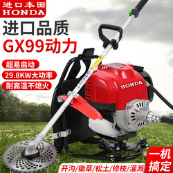 Honda GX99 Murrant Murchants Side, висящая новое четыре бензинового бензина и заливая траву, чтобы открыть бесплодный ячмень