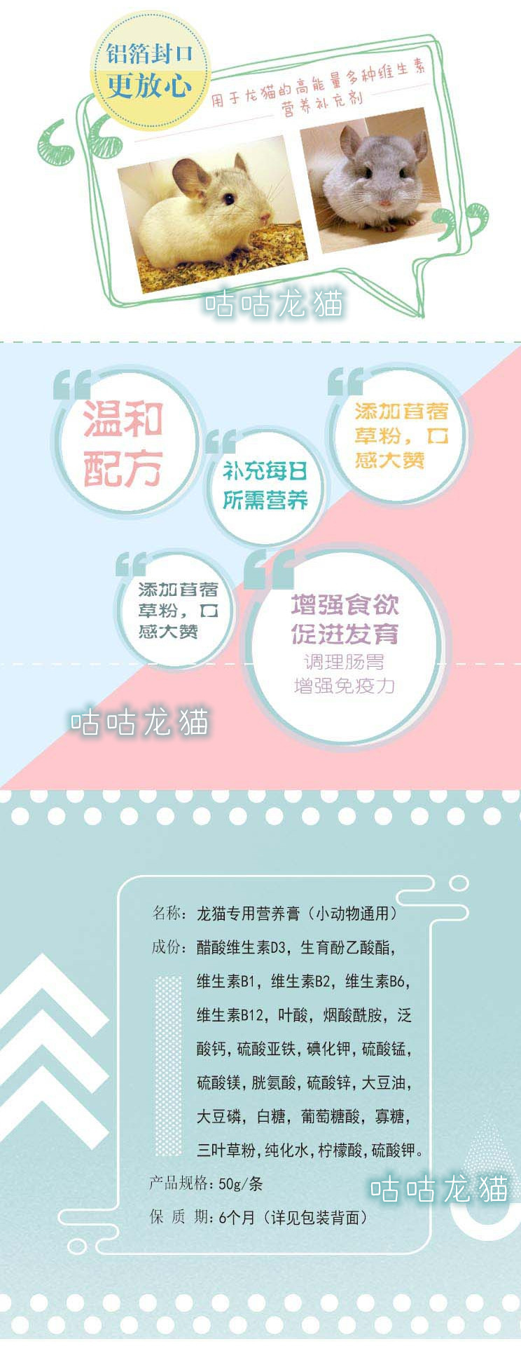 Разница между кремом для питания и кремом красоты:В дополнение к основным питательным веществам, содержащим пищевые пасты, он также добавляет питательные вещества (цистин), которые способствуют тому, что мой сосед Тоторо для увеличения метаболизма.Он более подходит для шиншиллов, которые более подходят для укуса волос, тяжелого выпадения волос или распыления волос.