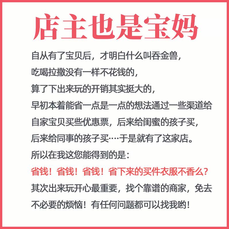 | Типы билетов: | Магазин Чэнду (1 большой и 1 маленький), Сопровождение (1 взрослый), Ханчжоу магазин (1 большой и 1 маленький), Шанхайский магазин Минханг (1 большой и 1 маленький), Шэньчжэнь магазин (1 большой 1 маленький), Магазин Nanjing (1 большой и 1 маленький), Шанхайский магазин Qiantan (1 большой и 1 маленький), Hangzhou Shop Electronic Coupon, Магазин Changsha (1 большой 1 маленький) |