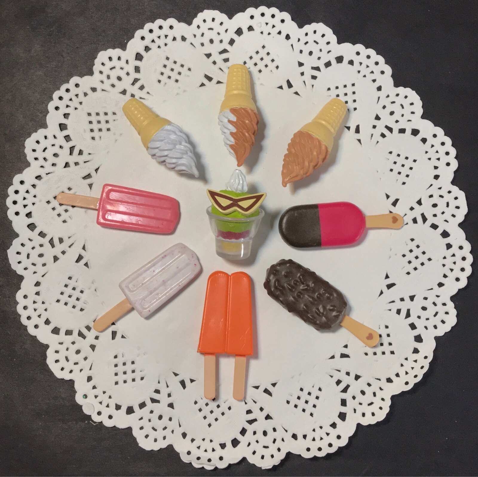 Настоящий сыпучий товар имеет дефекты, пятна и отслаивающуюся краску. Пожалуйста, будьте осторожны при фотографировании. Мороженое: 5см. Зеленая чашка для мороженого: 4см. Двухцветное шоколадное, белое, розовое и оранжевое мороженое: 5,8см.