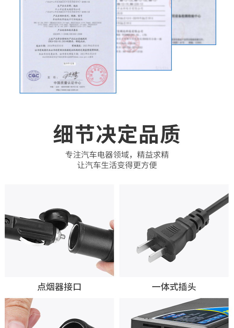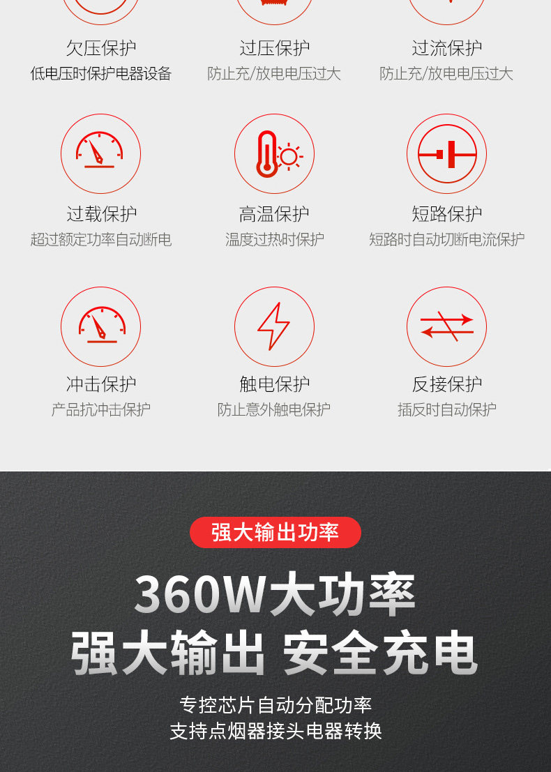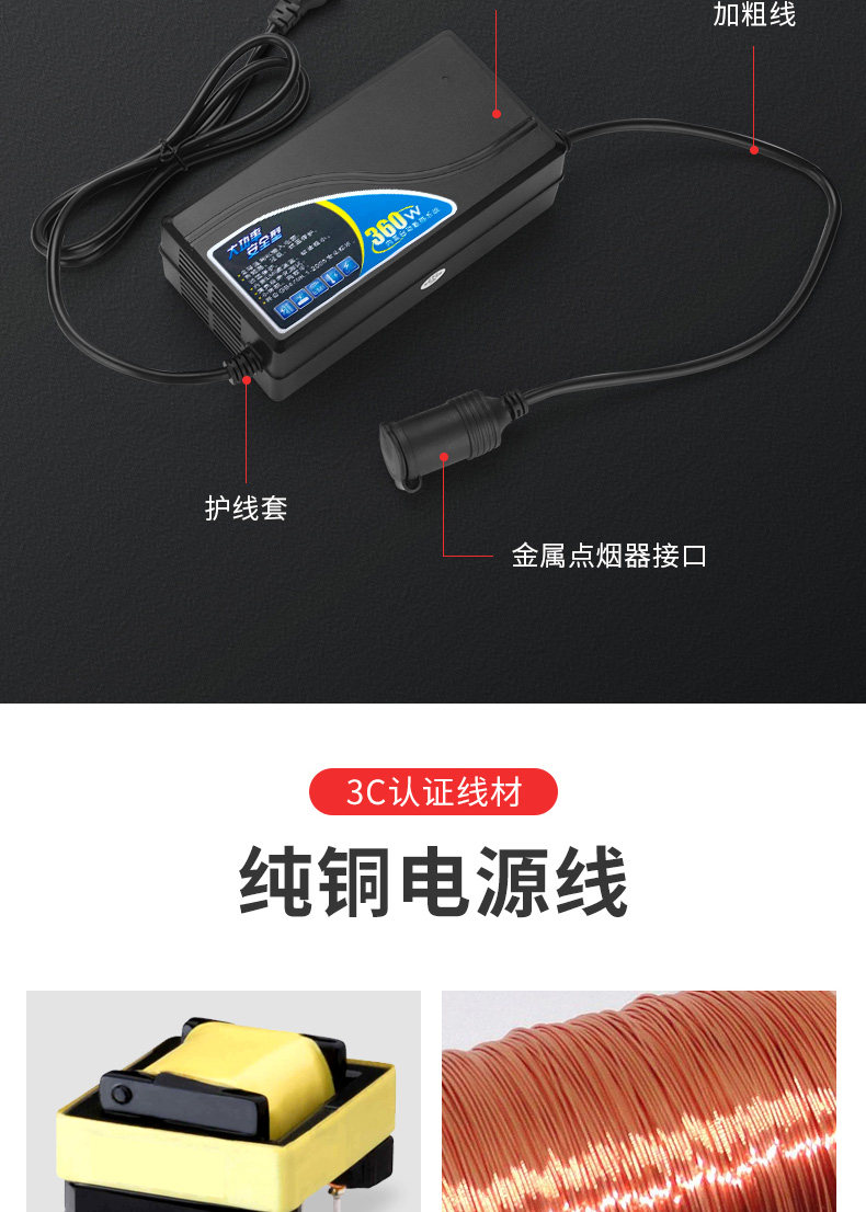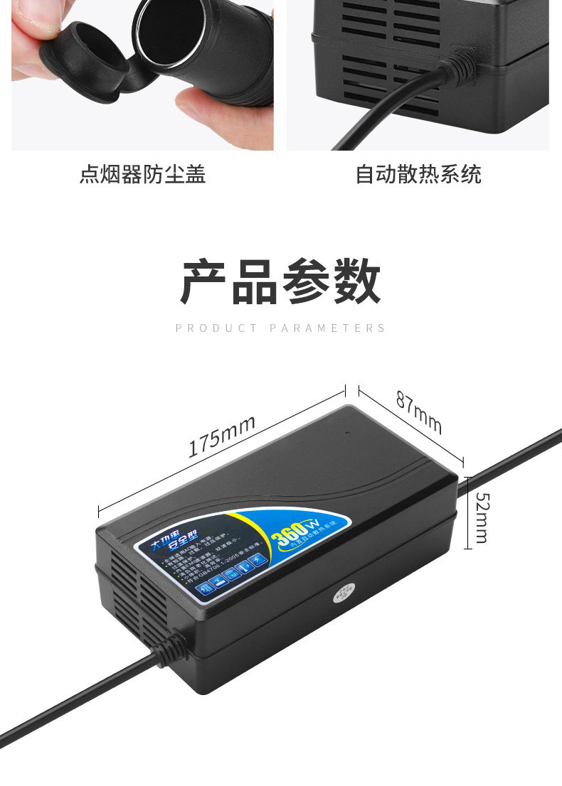 Совместимый с большинством средств транспортных средств на рынке, энергоснабжение с высокой степенью мощности может привести к прибору с низкой мощностью, а небольшая мощность не может привести к прибору электрических приборов с высокой силой.