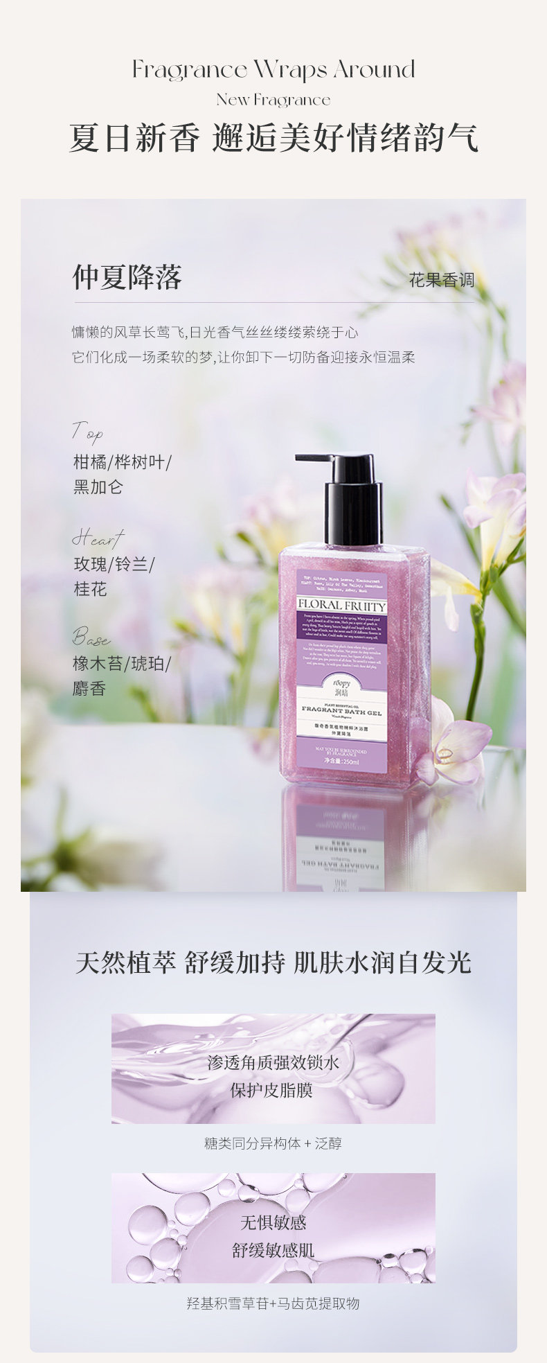 Парфюмированный летний увлажняющий освежающий гель для душа со стойким ароматом, долговременный эффект, глубокое очищение, 250 мл
