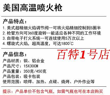 Этот спрей -это специальная фонаришка в Соединенных Штатах. Используйте преобразователь после использования преобразователя. Используйте банки с плоским газом и длинные газовые банки на рынке.Температура может достигать 1300-1500 ° C. Это супер-сильное спиральное пламя.Продукт поставляется с электронной пожарной системой.чистыйМатериал трубки из медного оружия, долговечный, сжигая!Общая длина после установки составляет около 26 см.