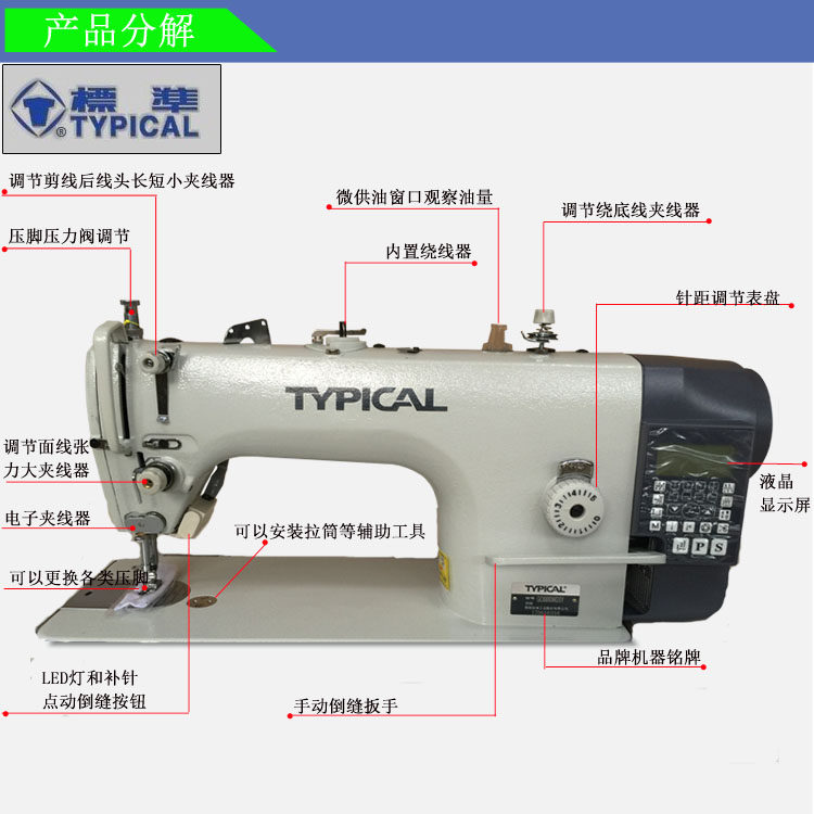 Функция: автоматическая резка, автоматическая строчка, автоматический игрок, автоматическая строчка, автоматическое подъем ног, одноксельный игла, со светодиодным освещением (регулируемая яркость), встроенный нижний проволочный намотчик;