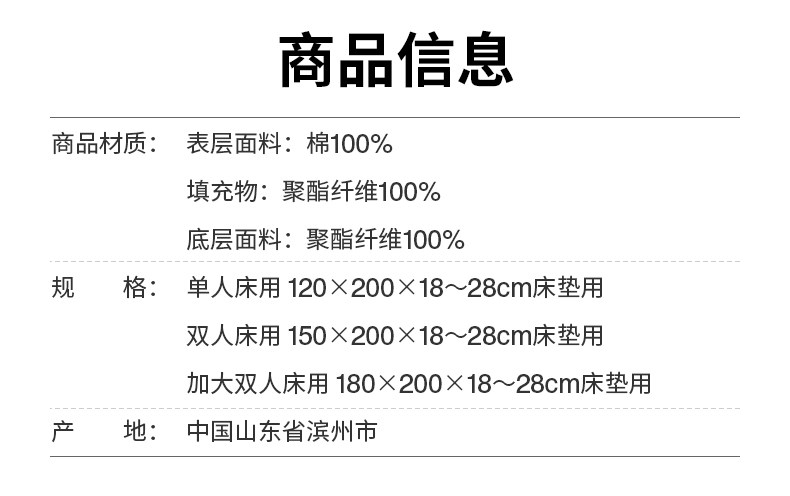 | Размеры простыней/кроватей: | Односпальная кровать для матраса 120 × 200 × 18 ~ 28 см., Двухместная кровать для матраса 150 × 200 × 18 ~ 28 см., Увеличьте матрас 180 × 200 × 18-28 см для двуспальной кровати |
