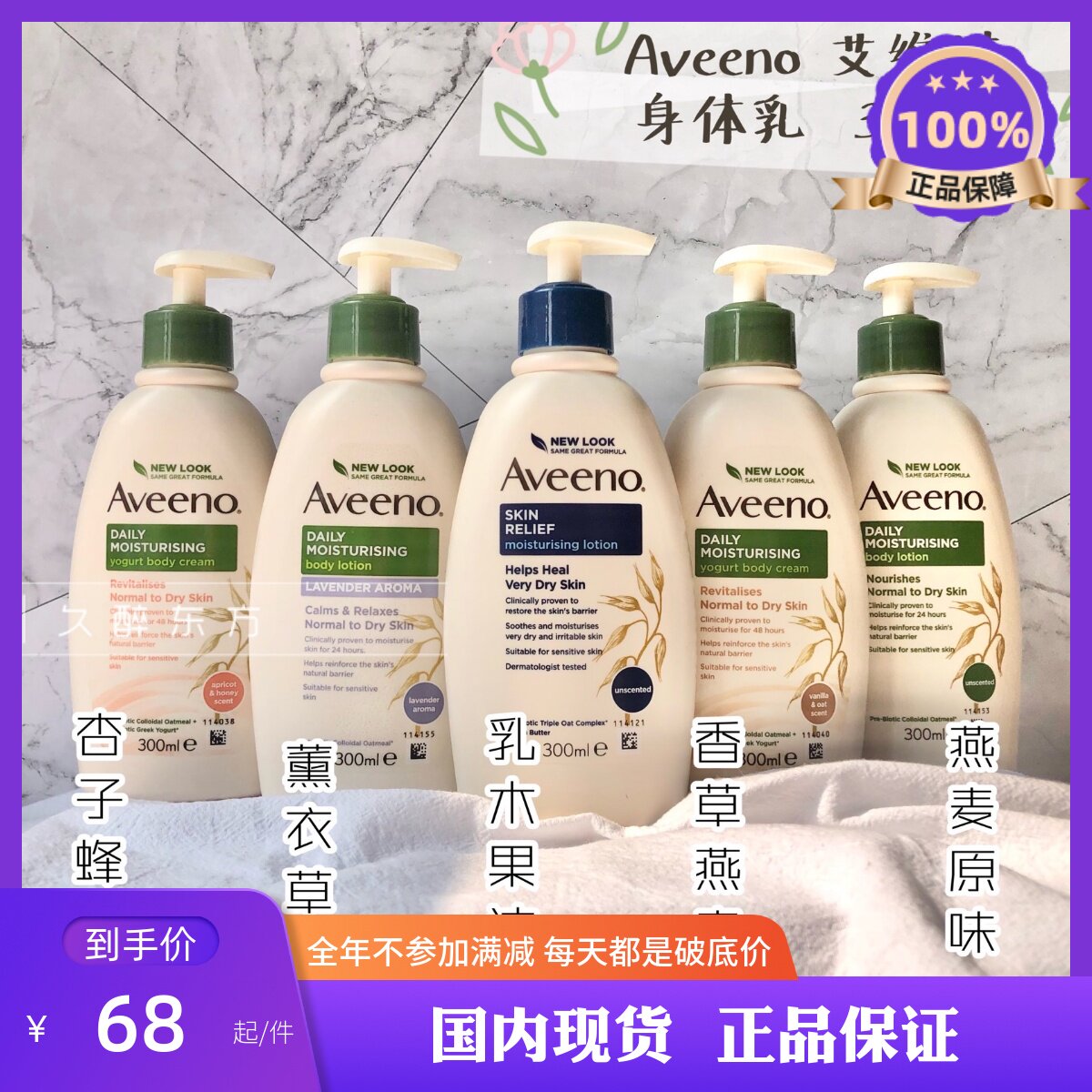 Aveeno Увлажняющий лосьон для тела с овсянкой и лавандой, абрикосом, медом, ванилью, маслом ши и сладким миндалем без запаха