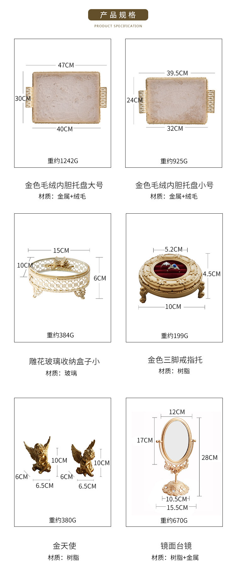 | Цвет: | Золотой цветной бархатный большой вкладыш, Золотой цветной бархатный маленький вкладыш, Лоток для кролика с золотой фольгой, Золотая фольга кроличьи украшения, Стеклянная коробка для хранения, Retro Gold Desktop Makeup зеркало, Серебряный цвет буровой бабочки, Золотое трехлетнее кольцо, Полное медное кольцо доверие, Смола фоторамка, Золотая гальваническая ваза (керамика), Белая розовая луч, Комбинированная серия первая, Комбинированная серия вторая |