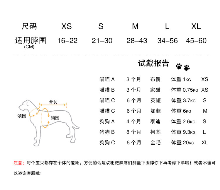| Размер: | Xs (шея, окружающая 16-22), S (шея около 21-30), М (шея окружает 28-43), L (шея окружает 34-56), XL (45-60 шея) |