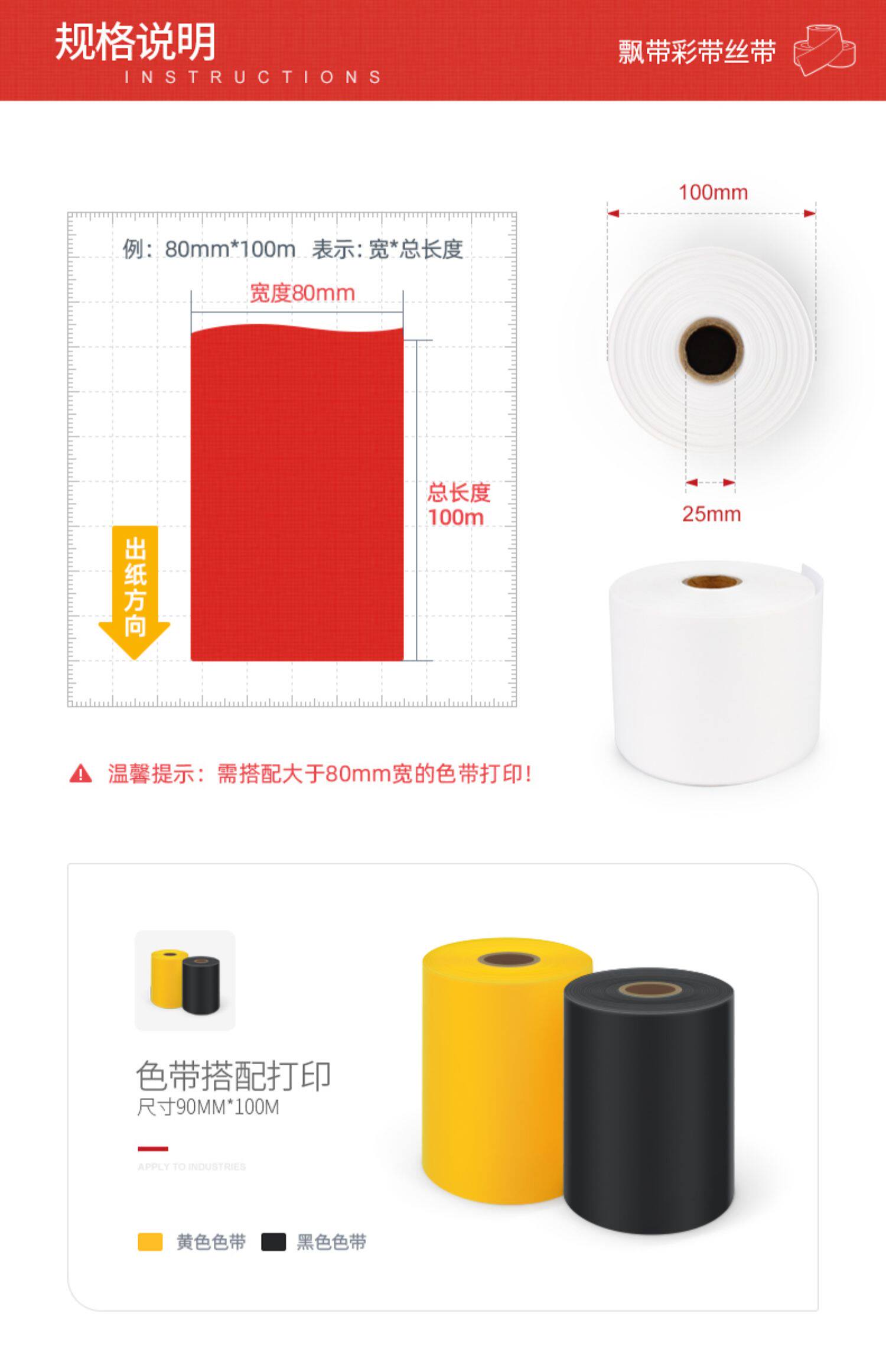 Красная лента, белый совместимый черный принтер, 80мм, 100м