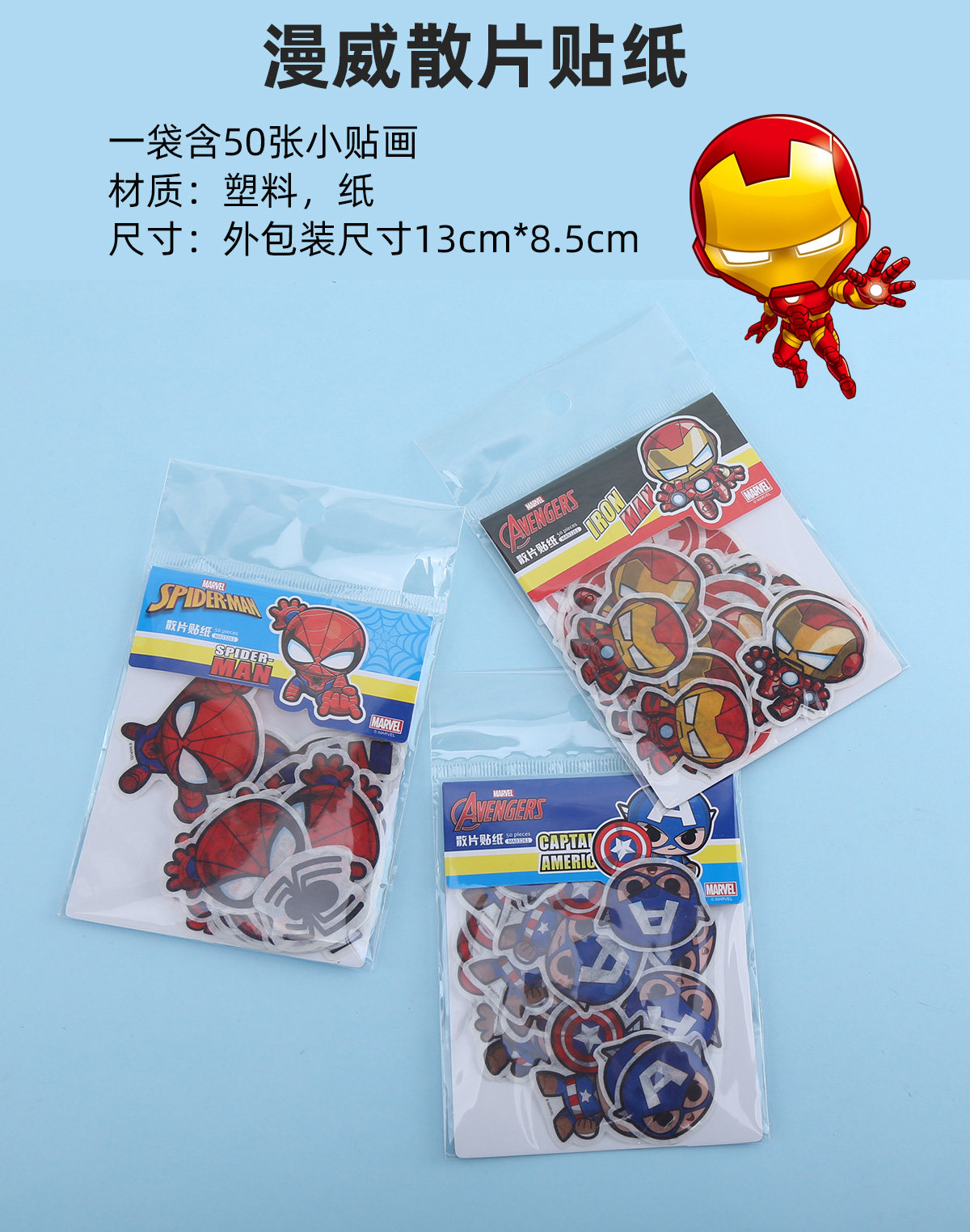 | Цвет: | Паук -ман 1 сумка (в том числе 50 наклеек), Капитан Америка 1 сумка (включая 50 наклеек), Мешок Железного человека 1 (включая 50 наклеек), Три сумки (одна сумка из трех типов) |